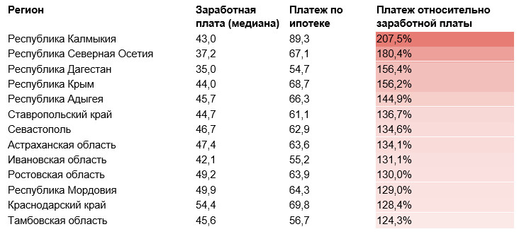 В четырех российских регионах — Калмыкии, Северной Осетии, Дагестане и Крыму — ипотечный платеж в полтора раза и более выше средней заработной платы. Проще всего оплачивать рыночную ипотеку жителям северных регионов и Дальнего Востока.