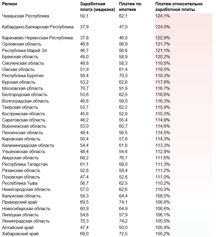 В большинстве регионов России ежемесячный платеж по рыночной ипотеке превысил средний размер заработной платы