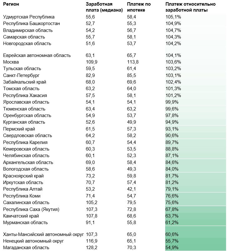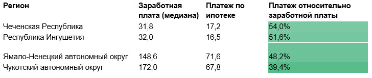 Всего регионов, где платеж по ипотечному кредиту превышает размер медианной заработной платы — 59, в 26 оставшихся — он ниже ежемесячного дохода населения. Наиболее благоприятная ситуация складывается в субъектах с относительно высокими доходами населения — в северных регионах и регионах Дальнего Востока. Легче всего оплачивать рыночную ипотеку жителям Чукотки и ЯНАО.