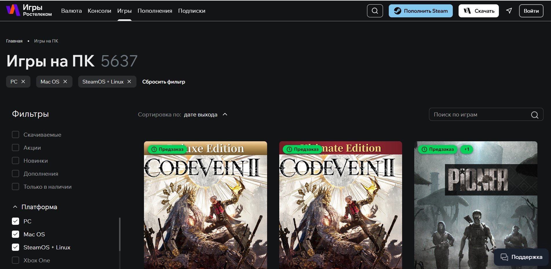 На данный момент пользователям доступно 6 тыс. игр для PC, PlayStation и Xbox, а также различные внутриигровые валюты и игровые подписки. «Ростелеком» подчеркивает свою готовность поддерживать российских разработчиков и внедрил правила модерации для обеспечения безопасности пользователей.