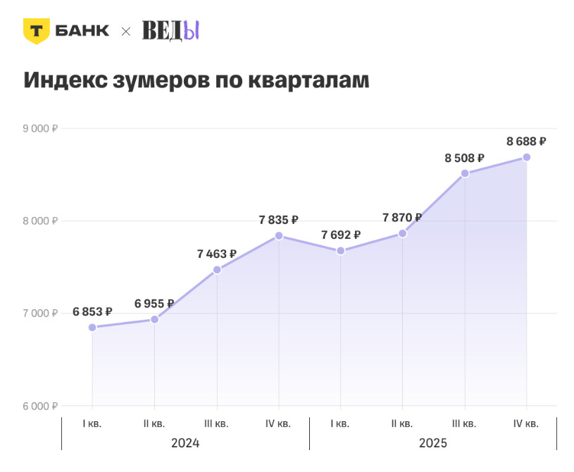 - В 2025 году расходы поколения Z на товары и услуги, входящие в «зумерские категории», в среднем увеличились на 8 688 рублей, что на 11% больше, чем в 2024 году.