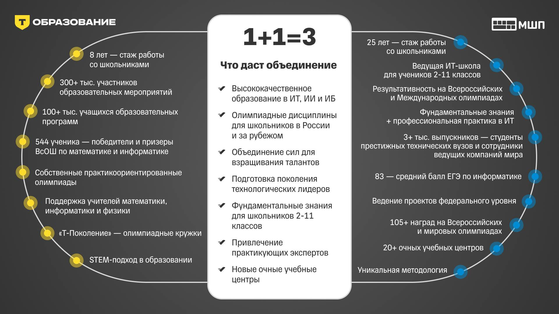 МШП существенно укрепит ключевое стратегическое направление деятельности Т-Образования по взращиванию талантов и подготовке нового поколения технологических лидеров. Объединение позволит расширить возрастной диапазон программ Т-Образования. Обучение станет доступным для школьников уже со 2 класса, обеспечивая более глубокое погружение в предмет и формируя систему фундаментальных знаний.