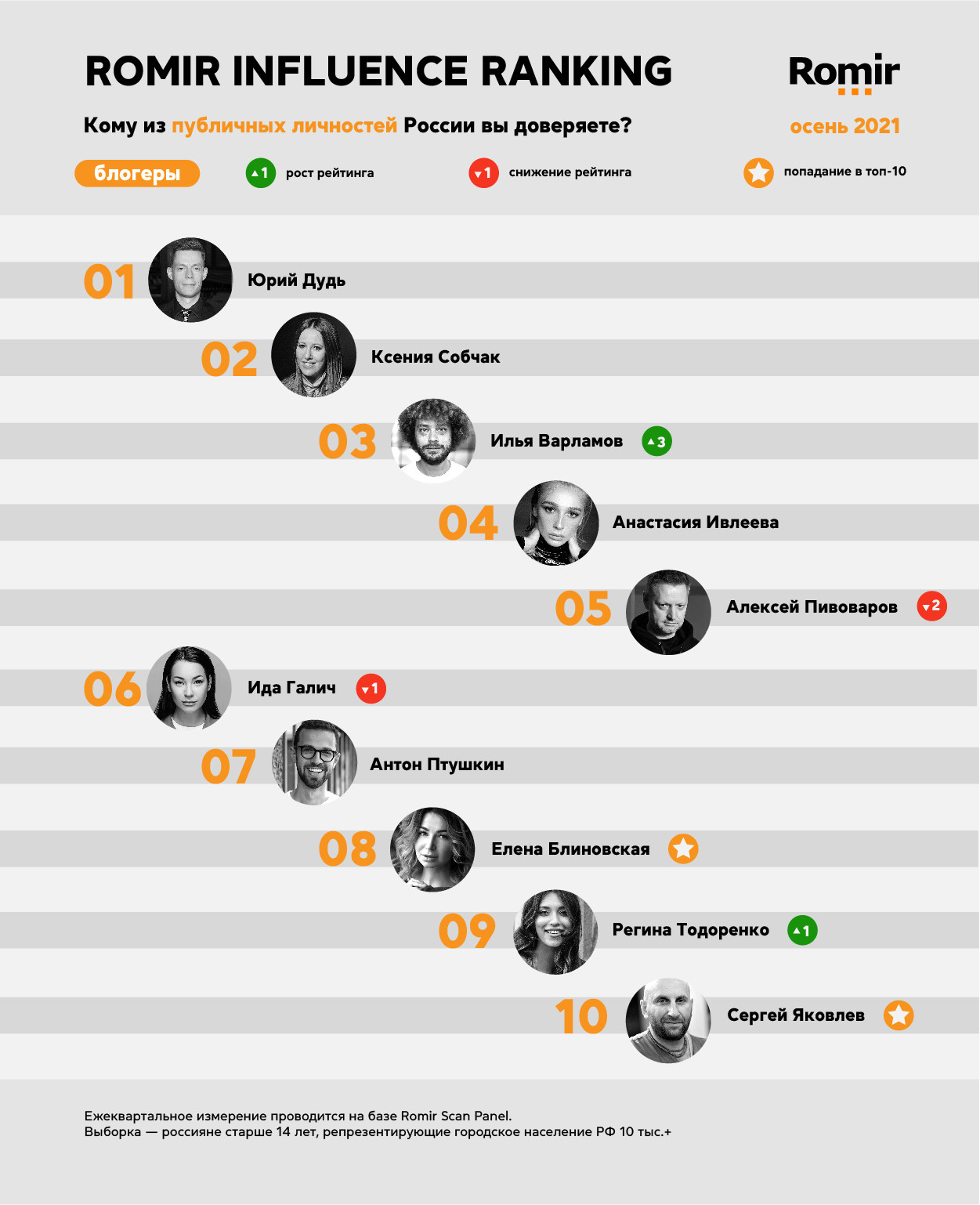 Тройка лидеров этой осенью такая: Юрий Дудь, Ксения Собчак и Илья Варламов (он поднялся на три позиции). Тем самым Варламов потеснил Анастасию Ивлееву (4 место) и Алексея Пивоварова (5 место).