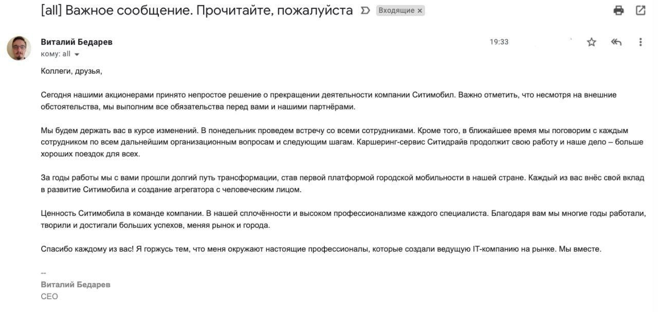 Акционеры сервиса городской мобильности «Ситимобил» приняли решение о прекращении деятельности компании. Все обязательства перед сотрудниками и партнерами будут выполнены в полном объеме в рамках действующего законодательства,