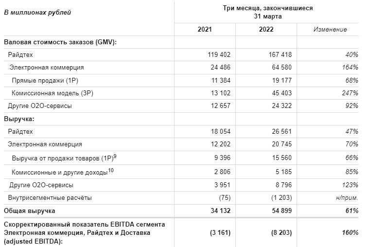 Обзор ключевых консолидированных финансовых показателей за три месяца, закончившихся 31 марта 2021 и 2022 годов. Раскрытие выручки по сегментам отражено ниже. Остаток денежных средств, денежных эквивалентов и депозитов на 31 марта 2022 года: Обзор выручки по сегментам Чтобы лучше отражать операционные показатели компании, начиная с первого квартала 2022 года Яндекс вносит следующие изменения в структуру сегментов, в соответствии с которой компания отчитывалась о финансовых результатах ранее: *О2О-сервисы (online-to-offline) — интернет-сервисы, предоставляющие технологическую возможность совершать покупки и заказывать услуги онлайн, а получать их в реальном мире. Данные изменения применяются к предыдущим финансовым периодам ретроспективно. Поиск и портал Сегмент Поиска и портала включает Поиск, Геосервисы, Яндекс 360, Погоду, Новости, Путешествия, голосового помощника Алису и ряд других сервисов Яндекса в России, Беларуси и Казахстане. Ключевые операционные показатели: В первом квартале 2022 года выручка в сегменте Поиска и портала выросла на 25%, а выручка за вычетом вознаграждения партнёрам — на 30% по сравнению с аналогичными показателями год назад. Этот результат в первую очередь связан с ростом Рекламной сети Яндекса за счёт развития рекламных продуктов и технологий, а также с укреплением нашего основного бизнеса — Поиска, доля которого выросла на всех ключевых платформах. Что касается наших рекламных партнёров, сегмент малого и среднего бизнеса продемонстрировал высокую устойчивость и внёс основной вклад в рост выручки в этом квартале, в то время как на сегмент крупных клиентов негативно повлиял уход с рынка международных рекламодателей и заморозка рекламных бюджетов отечественных компаний. Рентабельность скорректированного показателя EBITDA (adjusted EBITDA margin) в первом квартале 2022 года составила 42,0%, тогда как в первом квартале 2021 года этот показатель составлял 49,0%. Без учета единовременных расходов на персонал в марте 2022 года рентабельность скорректированного показателя EBITDA в сегменте Поиска и портала составила 46,4%. На динамику рентабельности в годовом исчислении также повлияли наши затраты на продуктовый и перформанс-маркетинг для поддержки роста поисковой доли на мобильных платформах, включая iOS (где мы добились значительного увеличения доли — на 2,9 п.п. за квартал). Электронная коммерция, Райдтех и Доставка В сегмент Электронная коммерция, Райдтех и Доставка входят транзакционные О2О-сервисы. 1. Райдтех включает сервис заказа такси в России, СНГ, а также странах Европы, Ближнего Востока и Африки, сервис аренды самокатов и сервис каршеринга для физических и юридических лиц Яндекс Драйв. 2. Электронная коммерция включает мультикатегорийную торговую платформу Яндекс Маркет, сервис гиперлокальной доставки продуктов и хозяйственных товаров Яндекс Лавка в России и сервис доставки продуктов из магазинов Яндекс Еда. 3. Другие O2O-сервисы включают Яндекс Доставку — сервис доставки на этапе «последней мили» для физических и юридических лиц, сервис доставки заказов из ресторанов Яндекс Еда, сервис гиперлокальной доставки продуктов и хозяйственных товаров Яндекс Лавка Израиль, а таже несколько небольших экспериментальных O2O-сервисов. Ключевые операционные показатели: Яндекс Маркет Райдтех Валовая стоимость заказов (GMV) на сервисах Рай