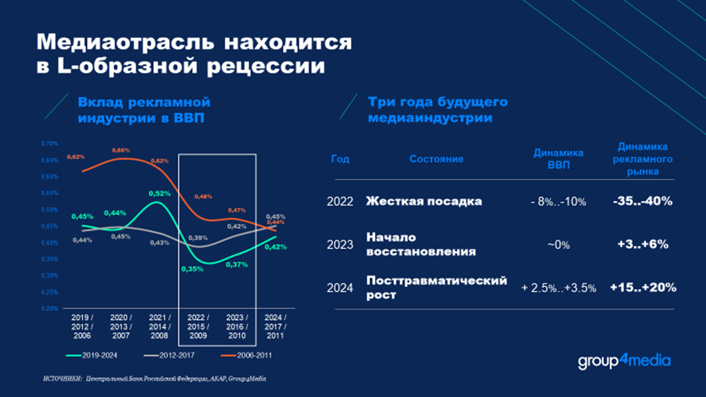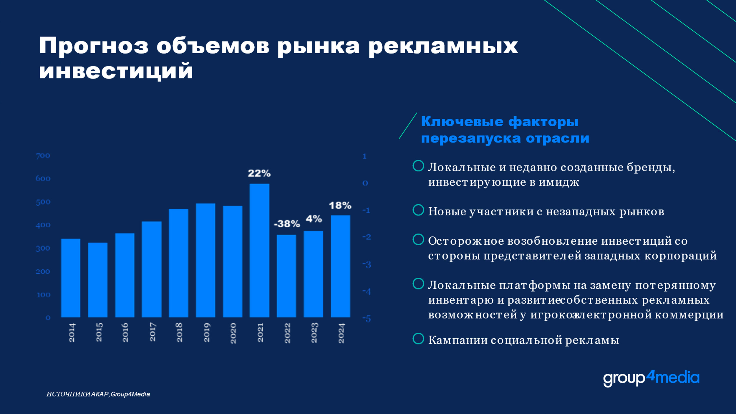 С учетом текущего прогноза по динамике ВВП и сложившейся ситуации мы ожидаем, что рекламный рынок России будет трансформироваться. Прогнозируем рост спроса на рекламу со стороны российских компаний. Параллельный импорт даст позитивный вклад, но неравномерный по медиа, оказывая поддержку, прежде всего, ритейл, e-com и performance. Однако, существенно сократится вклад в рекламу международных компаний. Притом, что, возможно, вырастет доля азиатских брендов. Мы предполагаем, что рекламный рынок вернется к позитивной динамике не ранее второго квартала 2023 года,