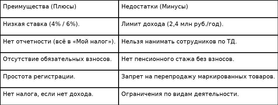 Режим налога на профессиональный доход имеет свои сильные и слабые стороны: Одним из ключевых минусов самозанятости является отсутствие обязательных страховых взносов. Это означает, что у самозанятых граждан не формируется обязательный трудовой стаж и не копятся пенсионные коэффициенты, необходимые для получения страховой пенсии. Чтобы обеспечить себе будущую пенсию, самозанятым необходимо делать добровольные взносы в СФР. Размер этих взносов меняется ежегодно. Например, на 2025 год минимальный взнос, который формирует стаж, составляет 59 242 рубля. Таким образом, пенсия для самозанятых требует самостоятельного финансового планирования или добровольных отчислений. Самозанятость можно совмещать с работой по трудовому договору, где работодатель платит за сотрудника НДФЛ и страховые взносы, что позволяет формировать пенсионный стаж. Однако нельзя работать как самозанятый со своим текущим или бывшим работодателем, если с момента увольнения прошло менее двух лет. Платежи по налогу на профессиональный доход осуществляются ежемесячно: квитанция приходит до 12 числа следующего месяца, а оплата должна быть произведена до 28 числа. За просрочку начисляются пени. При сокрытии дохода или указании заниженной суммы в чеке, ФНС применяет штрафы: 20% от суммы за первое нарушение и 100% за повторное. При длительной неуплате долги могут быть взысканы принудительно через суд и приставов. В случае возникновения крупной задолженности, плательщики НПД могут воспользоваться процедурой банкротства физических лиц по Федеральному закону № 127-ФЗ. В этом случае, списание долгов по налогам, займам, ЖКХ и штрафам ГАИ происходит под контролем финансового управляющего, который работает с ипотеками в том числе. Например, такие специалисты, как Степанов Роман Сергеевич, помогают гражданам в вопросах банкротства в СПб физ лиц и списания долгов в СПб. Чтобы узнать подробнее, можно оставить заявку на звонок банкротства в санкт петербурге на сайте специалиста. Регистрация в качестве плательщика НПД проста и требует только паспорта и ИНН. Основные способы: Приложение «Мой налог» является основным инструментом: Что такое НПД? Это наиболее простой и выгодный налоговый режим для тех, кто работает без наемных сотрудников и не превышает лимит в 2,4 млн рублей в год. Если вы работаете из дома, не занимаетесь перепродажей и не нуждаетесь в лицензиях, налог на профессиональный доход — это идеальный выбор. Если же планируется расширение бизнеса, наем персонала или превышение ограничений по доходу самозанятых, стоит рассмотреть переход на УСН.