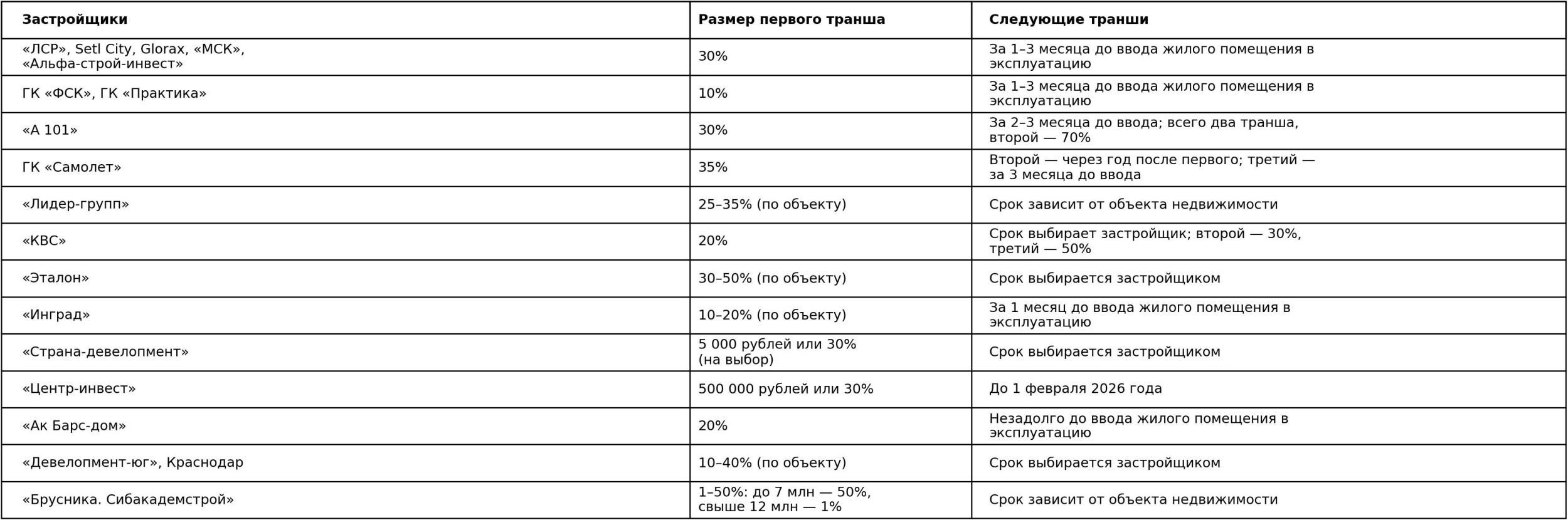 - Количество частей обычно ограничено: не более четырёх. Первый транш часто составляет 10–50% от общей суммы.