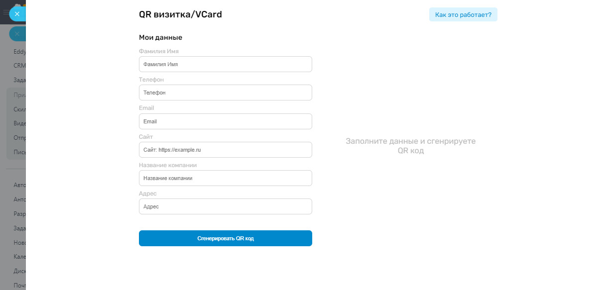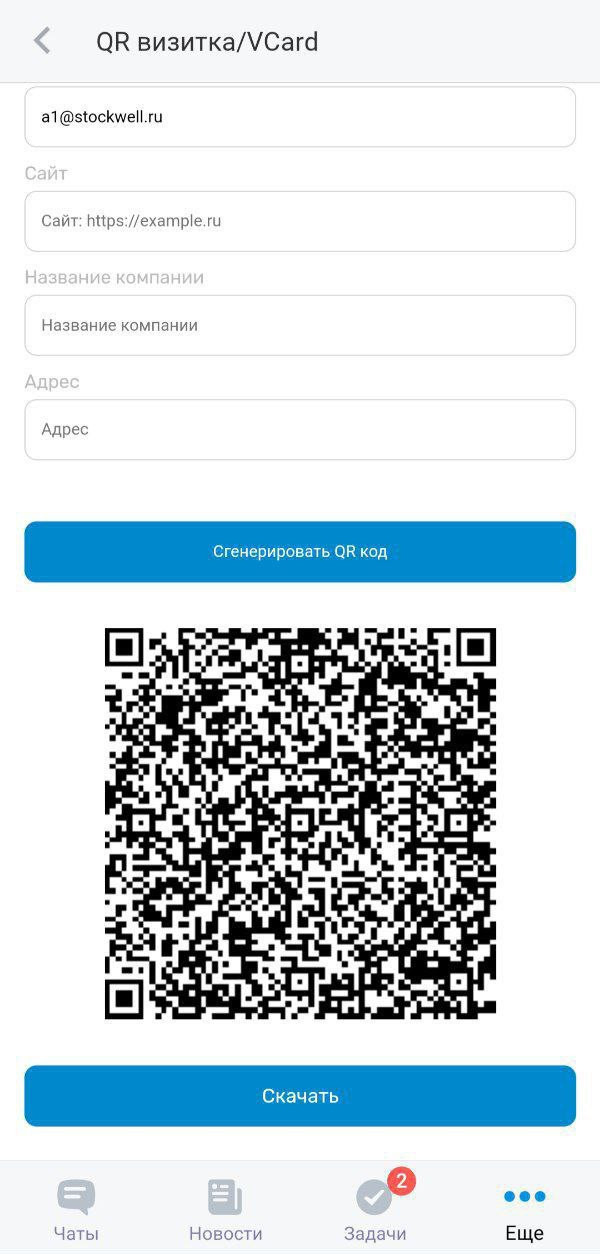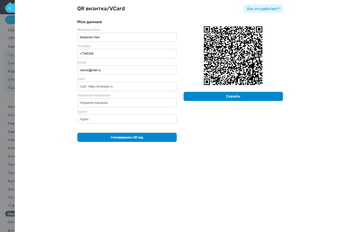 Наш основной вид деятельности — это внедрение Битрикс24, и приложения мы разрабатываем в основном именно для этой системы. Но новое приложение мы сделали в двух версиях — можно скачать приложение в ваш Битрикс 24 с маркета: «QR визитка/VCard» и моментально сгенерировать QR визитку в Битрикс24. Приложение подтянет ваши данные из CRM. Если Вы хотите изменить данные для визитки, вы можете это сделать и поправить любое поле, взятое из CRM. Работает также в мобильной версии Битрикс24.