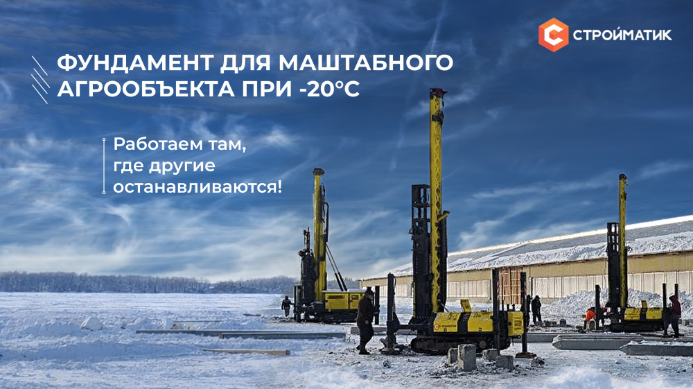 Животноводческий комплекс «Юбилейный» в Грязовецком районе Вологодской области — это промышленный объект агропромышленного комплекса, рассчитанный на 3230 голов крупного рогатого скота. И здесь технология СТРОЙМАТИК доказала свою эффективность в условиях, где счёт идёт не на десятки, а на тысячи свай, а зимние морозы — не помеха, а рабочая среда.
