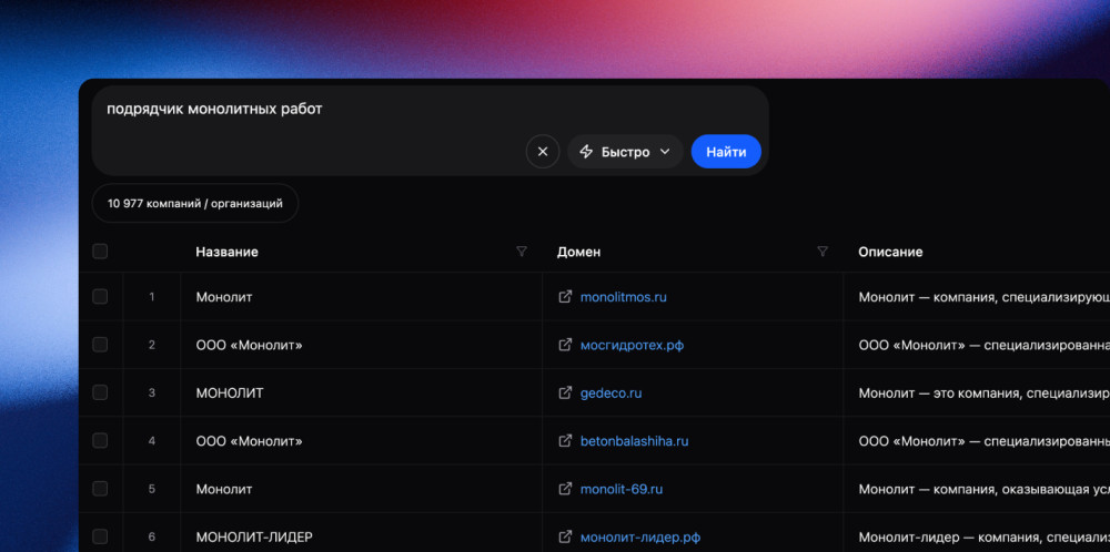 Это то, ради чего всё затевалось. Чтобы можно было забыть про фильтры и галочки в ограниченном списке ОКВЭДов и сегментов. Вы делаете запрос так, как будто просто ищете нужные компании: