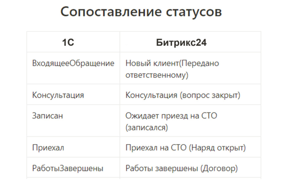 Также в системе часто появлялись дубликаты сотрудников. Например, когда человек переходил работать в другое подразделение, на него создавали новую карточку, но старая оставалась в системе. Есть и сотрудники, которые числятся сразу на нескольких ролях, например, как администратор и как мастер СТО, что тоже создавало путаницу. Чтобы компания могла работать эффективнее, нам необходимо было интегрировать все три системы. Частные сложности также требовали решения — и мы принялись за дело. Перед тем как нагружать вас техническими деталями, расскажем простыми словами, какой подход мы выбрали. Мы создали для «Кореаны» сквозную интеграцию между системами через шину данных Apache Kafka для обмена информацией в режиме реального времени. Она позволяет избегать задержек и потерь информации (в случае, если какая-либо из информационных систем отвалится), создавая единое информационное пространство. И вот как работает вся система. Мы отслеживаем два типа события — добавление и обновление сделок (заявок) в 1С и Битрикс24. Когда происходит одно из этих событий, система актуализирует данные пользователя во всех системах с помощью брокера сообщений на базе Apache Kafka. Обмен информацией организован на основе статусов сделок и является двусторонним: Одно из главных преимуществ такой интеграции — защита данных. Если одна из трех систем выходит из строя, данные не теряются, а сохраняются в брокере сообщений и отправляются в сервис-адресат, как только он снова станет доступен. Например, если менеджер по продажам зарегистрировал клиента в Битрикс24, а 1С в это время «отвалилась», брокер сохранит данные и позже направит их в 1С. Звучит не так уж сложно, да? Посмотрим, изменят ли это впечатление технические подробности. Чтобы вы не запутались, мы разбили описание работы на 2 больших этапа — подготовка и собственно интеграция. Помните проблему с ответственными, которую мы описывали в начале кейса? Ее нужно было решить первой, иначе вся система будет работать некорректно. Вместе с клиентом мы составили функциональные требования, где четко определили, как должна выглядеть заявка на ремонт. Мы прописали, как должны заполняться проблемные поля «Автор», «Ответственный» и «Подразделение», чтобы больше не было путаницы, а также прописали логику связи между конкретными техцентрами и их телефонными номерами, по которым обращаются клиенты. Кроме того, мы разработали логику интеграции данных о сотрудниках в 1С и Битрикс24: Затем мы составили операционные требования для интеграции, схему и логику работы всей системы в Miro, а после — техническое задание, и согласовали все с клиентом. Пришло время реализовывать интеграцию! Разберём поэтапно. Брокер сообщений В качестве основы мы использовали Apache Kafka по требованию клиента. Он способен обрабатывать миллионы сообщений в секунду, что важно для средних и крупных бизнесов сервисных услуг. Когда создается или изменяется заявка на ремонт, данные отправляются в Kafka, откуда их забирает другой компонент системы, и, если необходимо, возвращают их обратно в Kafka с изменениями или дополнениями. Битрикс24 → 1С В процессе обмена передаются следующие данные: Логика обмена данными такова: Этот алгоритм наглядно представлен на схеме ниже: Сопоставление статусов сделки Это очень важный пункт алгоритма. Вот как работает сопоставление: На обеи