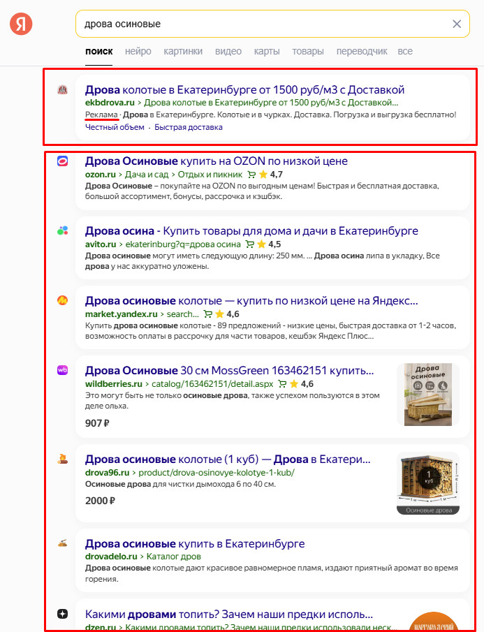 по запросу «дрова осиновые в Москве доставка цена» закончится заказом дров — очевидно,