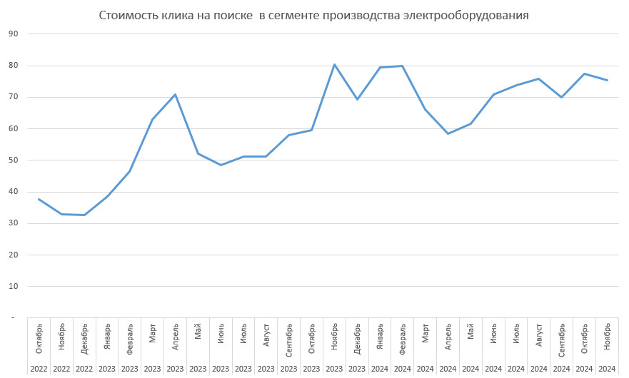 осени 2022 до осени 2024 года выросла более чем в два раза. В сегменте производства электрооборудования за тот же период стоимость клика на поиске выросла в 2,3 раза. Тут ярко выражена сезонность спроса — летом конкуренция ниже. В поисковой оптимизации самая