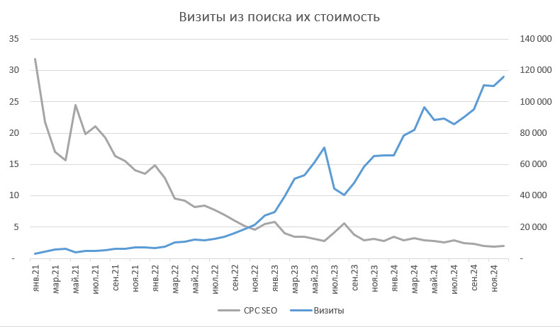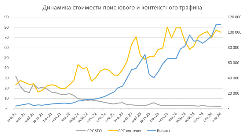 2021 года стоимость контекстного трафика конкурировала со стоимостью органического трафика и составляла около 25 рублей. К концу 2024 года трафик из поиска стоил дешевле трафика из контекста