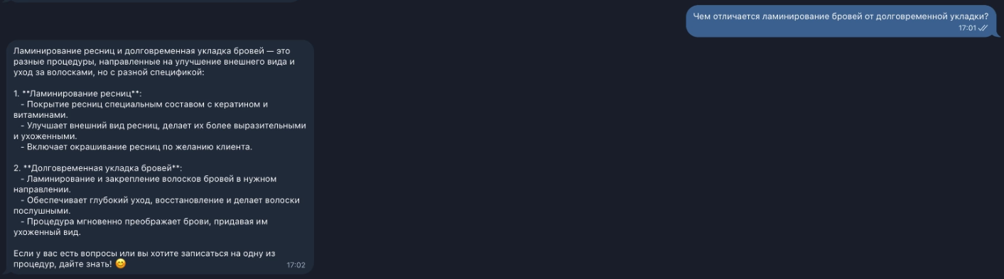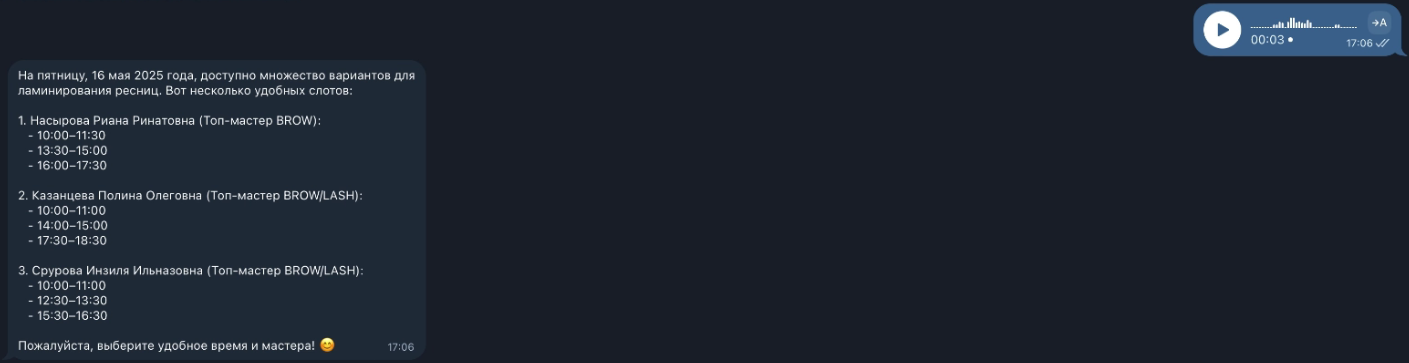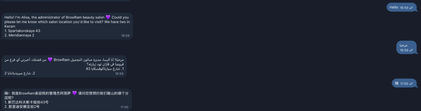 Как это работает: Клиент пишет в чат и бот фиксирует контакт, историю переписки и даже намерения. Данные сразу попадают в CRM — менеджер видит готовую карточку клиента. Результат: Ни одной пропущенной заявки, даже ночью или в выходные. Проблема: Иностранные клиенты уходят, потому что нет поддержки на их языке. Решение: AI-бот говорит на 50+ языках — от английского до китайского — без потери смысла. Пример: Клиент пишет по-арабски: «هل لديك موعد يوم السبت؟» («Есть запись на субботу?») Бот отвечает на арабском: «نعم، لدينا أماكن متاحة. أي وقت تفضل؟» («Да, есть места. Какое время вам удобно?») Результат: Вы не теряете 30% клиентов из-за языкового барьера. Проблема: Клиенты задают сложные вопросы («Чем отличается ламинирование бровей от долговременной укладки?»), а менеджеры путаются в ответах. Решение: — Бот анализирует базу знаний и дает точные ответы, как эксперт. — Бот проверяет Google-календарь и предлагает свободный слот. Результат: Клиент получает ответ за 3 секунды — без ожидания и ошибок. Проблема: 60% клиентов забывают о записи или не отвечают после первого контакта. Решение: Бот отправляет напоминания и мягко «дожимает» до покупки. Как это выглядит: — Клиент бронирует время, но не приходит. — Через день бот пишет: «Мы сохранили для вас слот на завтра в 15:00. Подтвердите, пожалуйста, запись!» + кнопка «Подтвердить». — Если клиент молчит — бот предлагает скидку: «Дарим 10% за повторную запись!» Результат: Снижение no-show на 40%. Проблема: Клиенты ленятся писать и отправляют голосовые, но менеджеры не успевают их слушать. Решение: Бот распознает голосовые и отвечает текстом или голосом. Пример из практики: — Клиент отправляет аудио: «Мне нужно записаться на ламинирование ресниц на 16 мая». — Бот переводит в текст и предлагает несколько слотов на выбранную дату Результат: Клиенты в восторге — общаться стало еще проще. — Конверсия +35%: клиенты получают ответы мгновенно. — Экономия на зарплатах: AI заменяет 2-3 менеджеров. — Лояльность клиентов: сервис без ожидания и ошибок. Готовы внедрить такого бота? Переходите на платформу — Suvvy.