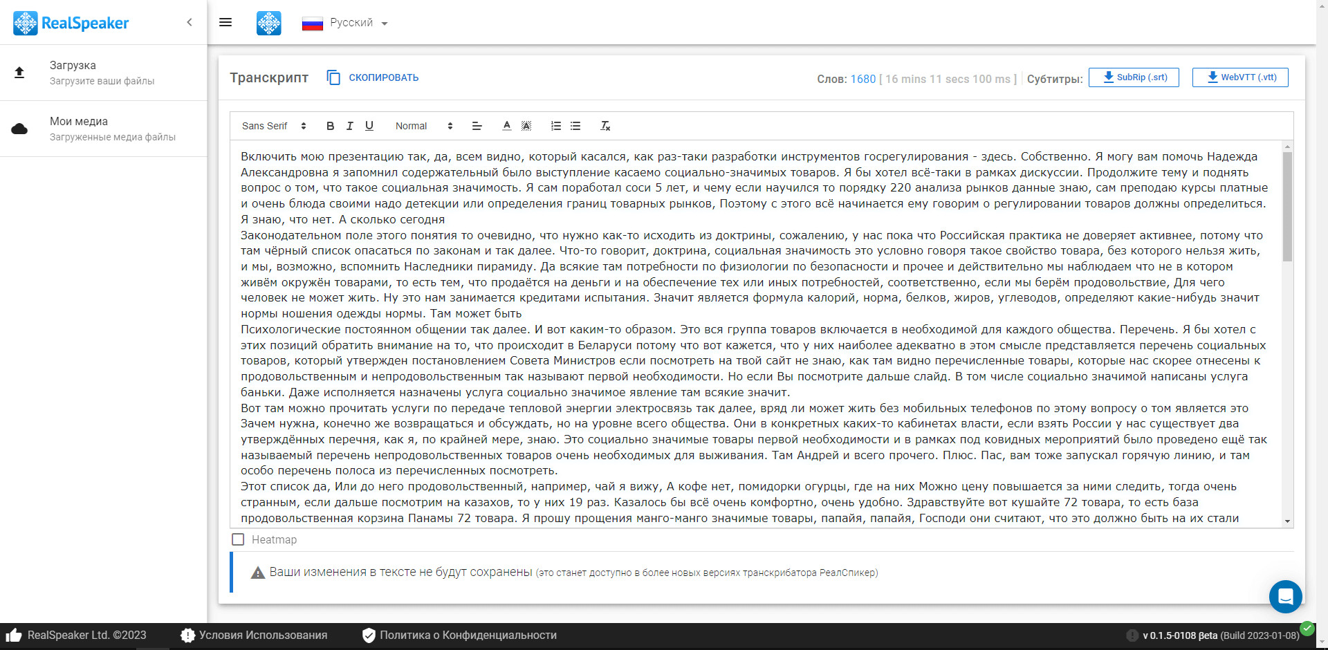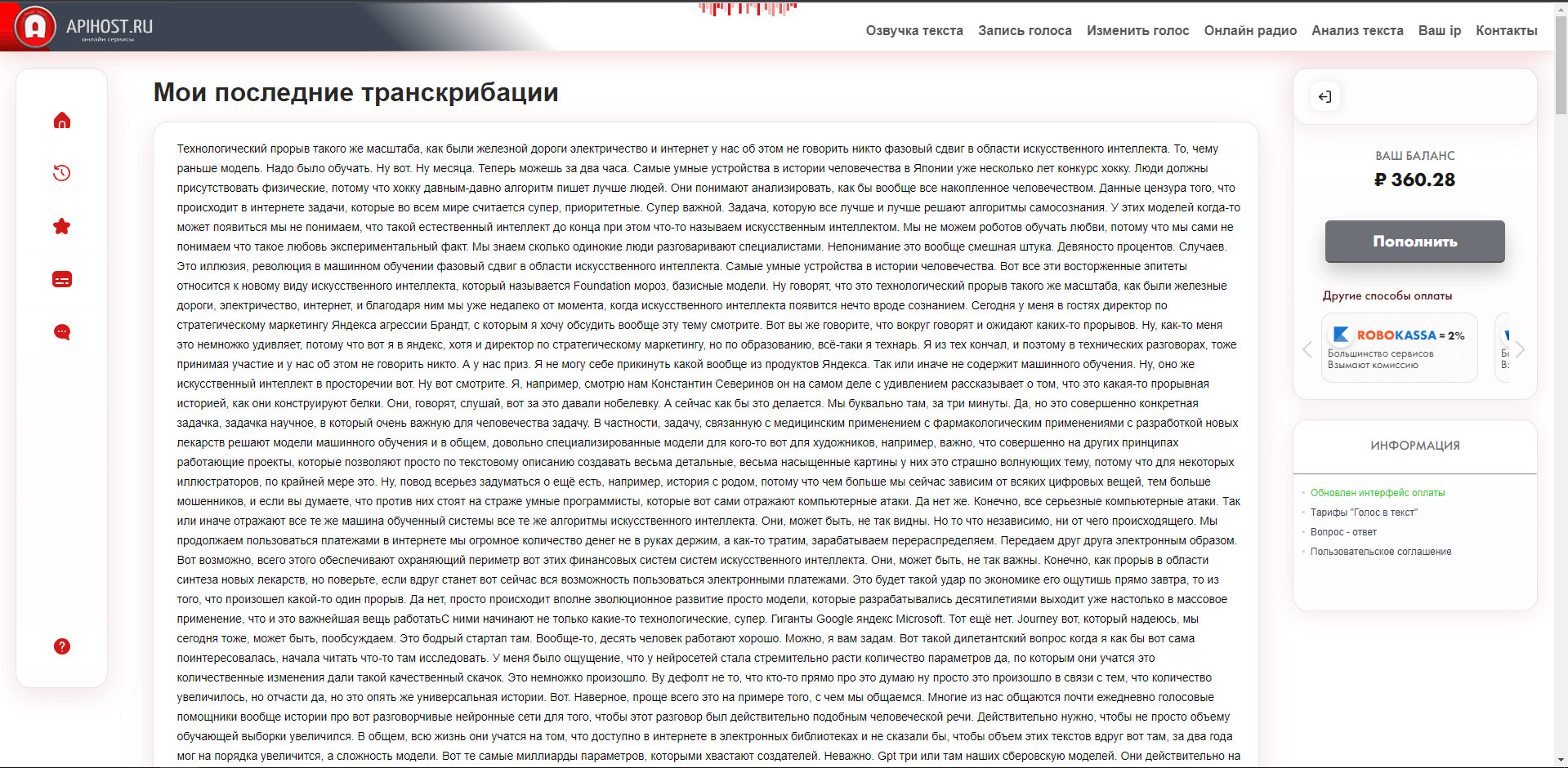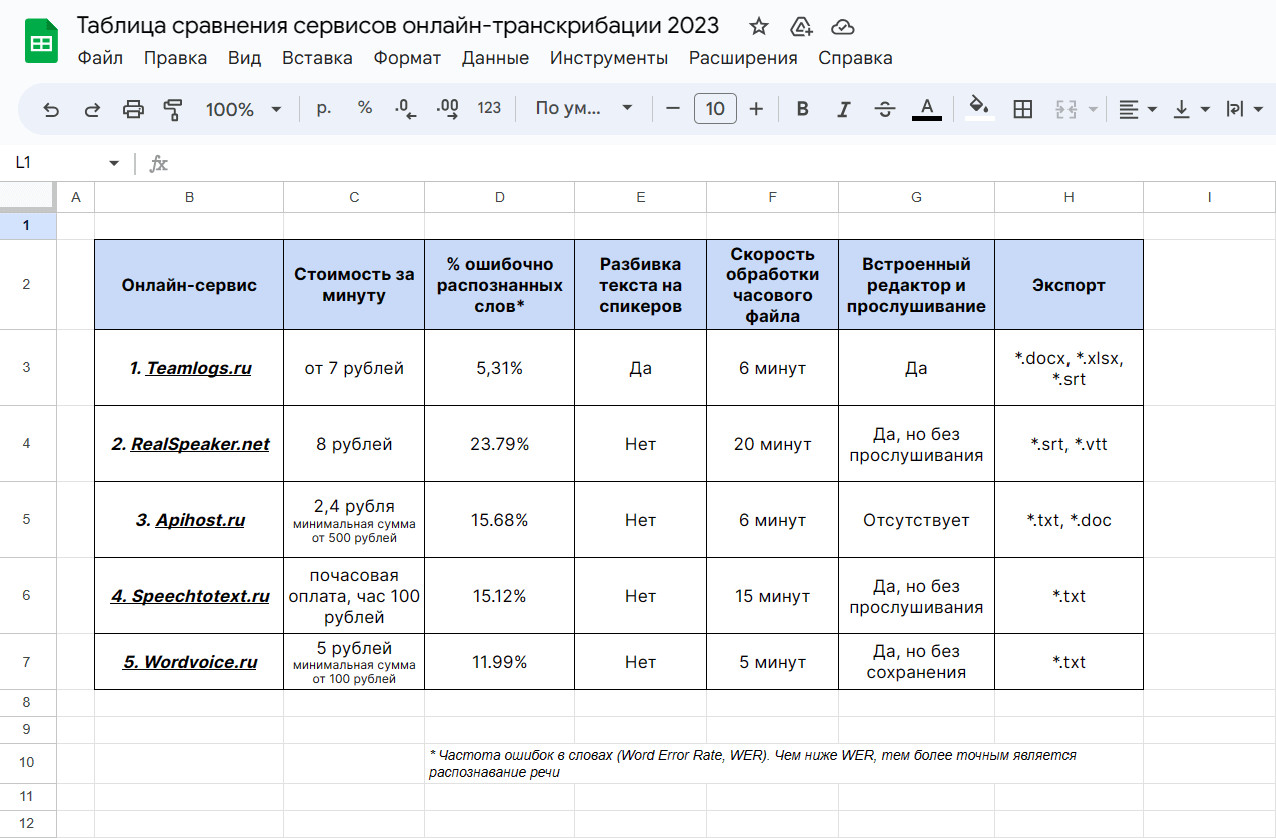 Дополнительно следует отметить встроенный редактор текста с прослушиванием аудио, который может быть полезен для ревью распознанного материала. Экспорт текста в форматах *.docx, *.xlsx, *.srt. Результат теста: На что стоит обратить внимание: Realspeaker.net — онлайн сервис с выбором множества языков для транскрибации. Стоимость минуты — 8 руб, бесплатно можно распознать аудио до 90 секунд, максимальная длительность загружаемого файла — 180 минут. Расшифровка тестового файла заняла 20 минут и стоила 427 рублей. После завершения процесса расшифровки сервис предлагает перейти в раздел «Мои медиа», где среди различных файлов (!), вам необходимо найти свой. В данном разделе вы можете найти распознанные файлы всех пользователей данного сервиса. Текст мы получили без разбивки на спикеров. Сервис позволяет редактировать полученный текст, но без прослушивания и без сохранения изменений. Позже, когда мы вернулись за своим файлом в сервис, мы не смогли его найти, поэтому на картинке скрин рандомного файла. Полученный текст можно скопировать, либо скачать в форматах *.srt или *.vtt Результат теста: На что стоит обратить внимание: Apihost — набор различных сервисов по работе с аудио и текстами, в числе которых есть и распознавание речи. Стоимость за минуту записи 2.4 руб, максимальный лимит на размер файла 200 мб. Чтобы загрузить файл бОльшего размера нужно писать на почту в поддержку. Стоимость транскрибации тестового файла составила 139,72 рублей, но заплатить пришлось 500 рублей, так как это минимальная сумма пополнения. По скорости расшифровки: первая загрузка файла завершилась неудачей, сервис не отвечал в течение 15 минут, пришлось грузить повторно. Со второй попытки файл был переведен в текст за 6 минут. Текст со знаками препинания, но без разбивки по спикерам. После транскрибации сервис не позволяет редактировать файл, его можно только посмотреть. Текст скачать можно как файл *.txt, *.doc или просто скопировать текст. Результат теста: На что стоит обратить внимание: Speechtotext.ru — онлайн-сервис по расшифровке аудио в текст, час распознавания здесь стоит 100 рублей, новым пользователям дают 10 тестовых минут. Сервис не позволяет загрузить файл, пока не пополнен счёт. Расшифровка тестового файла заняла 15 минут. Также у данного сервиса есть телеграм-бот, но там лимит по размеру файла 20 мб. Текст получился без разбивки на спикеров, онлайн-редактор есть, но без функции прослушивания, распознанный текст можно скачать в формате txt. Результат теста: На что стоит обратить внимание: Wordvoice.ru — сервис для расшифровки аудио или видеозапись в текст. Одна минута расшифровки здесь стоит 5 рублей, минимальная сумма пополнения счета 100 рублей. При регистрации сервис выдает 90 рублей в кошелек для тестовых расшифровок. За транскрибацию тестового файла заплатили 205 рублей, а готовая расшифровка появилась через 5 минут. Текстовую расшифровку сервис позволяет скачать с таймкодом и без. Предусмотрено встроенное редактирование текста без возможности сохранения. Результат теста: На что стоит обратить внимание: Мы подготовили сводную таблицу, в которой отображены результаты тестирования онлайн-сервисов для расшифровки речи в текст на русском языке. Эта таблица позволит ознакомиться с основными параметрами сервисов, такими как стоимость, качество расшифровки, наличие и функциональность редактора те