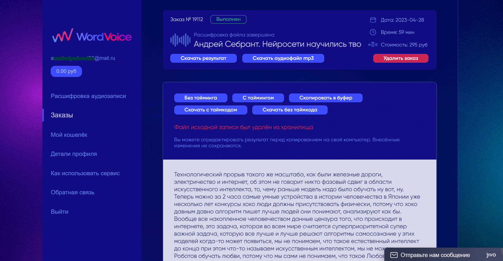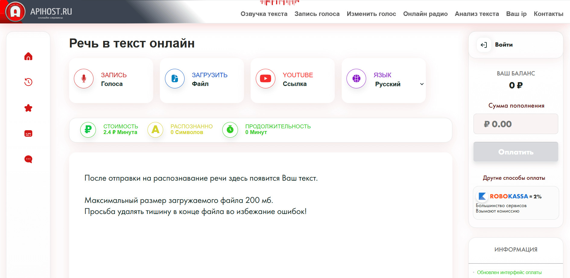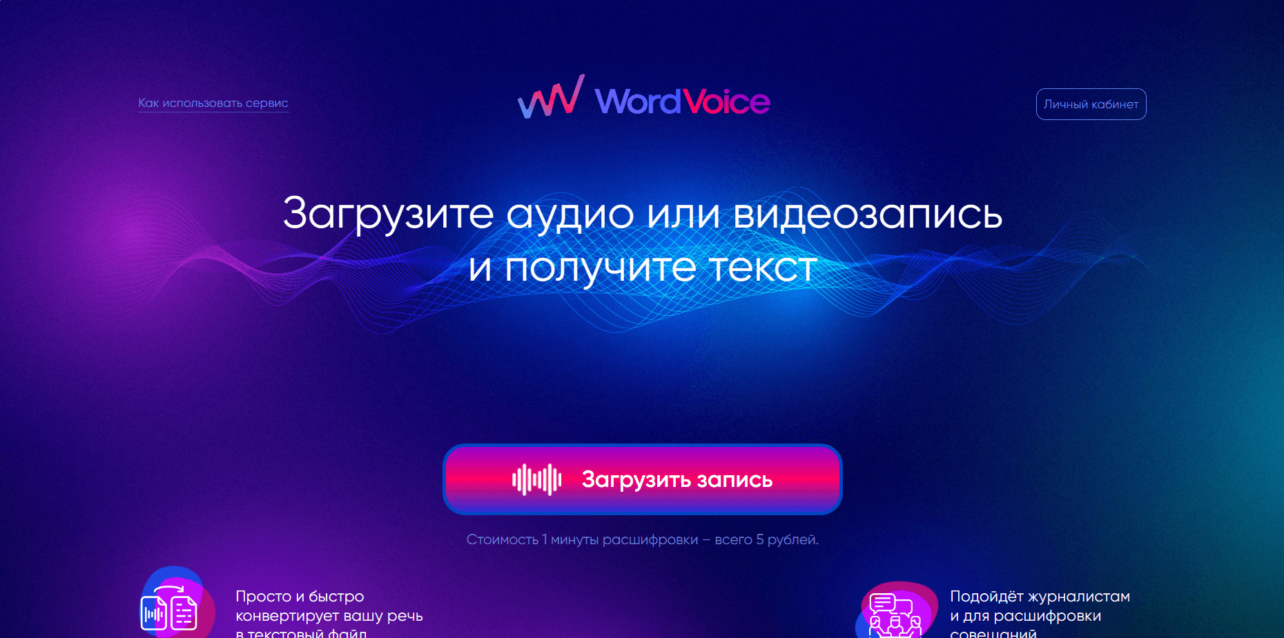 Дополнительно следует отметить встроенный редактор текста с прослушиванием аудио, который может быть полезен для ревью распознанного материала. Экспорт текста в форматах *.docx, *.xlsx, *.srt. Результат теста: На что стоит обратить внимание: Realspeaker.net — онлайн сервис с выбором множества языков для транскрибации. Стоимость минуты — 8 руб, бесплатно можно распознать аудио до 90 секунд, максимальная длительность загружаемого файла — 180 минут. Расшифровка тестового файла заняла 20 минут и стоила 427 рублей. После завершения процесса расшифровки сервис предлагает перейти в раздел «Мои медиа», где среди различных файлов (!), вам необходимо найти свой. В данном разделе вы можете найти распознанные файлы всех пользователей данного сервиса. Текст мы получили без разбивки на спикеров. Сервис позволяет редактировать полученный текст, но без прослушивания и без сохранения изменений. Позже, когда мы вернулись за своим файлом в сервис, мы не смогли его найти, поэтому на картинке скрин рандомного файла. Полученный текст можно скопировать, либо скачать в форматах *.srt или *.vtt Результат теста: На что стоит обратить внимание: Apihost — набор различных сервисов по работе с аудио и текстами, в числе которых есть и распознавание речи. Стоимость за минуту записи 2.4 руб, максимальный лимит на размер файла 200 мб. Чтобы загрузить файл бОльшего размера нужно писать на почту в поддержку. Стоимость транскрибации тестового файла составила 139,72 рублей, но заплатить пришлось 500 рублей, так как это минимальная сумма пополнения. По скорости расшифровки: первая загрузка файла завершилась неудачей, сервис не отвечал в течение 15 минут, пришлось грузить повторно. Со второй попытки файл был переведен в текст за 6 минут. Текст со знаками препинания, но без разбивки по спикерам. После транскрибации сервис не позволяет редактировать файл, его можно только посмотреть. Текст скачать можно как файл *.txt, *.doc или просто скопировать текст. Результат теста: На что стоит обратить внимание: Speechtotext.ru — онлайн-сервис по расшифровке аудио в текст, час распознавания здесь стоит 100 рублей, новым пользователям дают 10 тестовых минут. Сервис не позволяет загрузить файл, пока не пополнен счёт. Расшифровка тестового файла заняла 15 минут. Также у данного сервиса есть телеграм-бот, но там лимит по размеру файла 20 мб. Текст получился без разбивки на спикеров, онлайн-редактор есть, но без функции прослушивания, распознанный текст можно скачать в формате txt. Результат теста: На что стоит обратить внимание: Wordvoice.ru — сервис для расшифровки аудио или видеозапись в текст. Одна минута расшифровки здесь стоит 5 рублей, минимальная сумма пополнения счета 100 рублей. При регистрации сервис выдает 90 рублей в кошелек для тестовых расшифровок. За транскрибацию тестового файла заплатили 205 рублей, а готовая расшифровка появилась через 5 минут. Текстовую расшифровку сервис позволяет скачать с таймкодом и без. Предусмотрено встроенное редактирование текста без возможности сохранения. Результат теста: На что стоит обратить внимание: Мы подготовили сводную таблицу, в которой отображены результаты тестирования онлайн-сервисов для расшифровки речи в текст на русском языке. Эта таблица позволит ознакомиться с основными параметрами сервисов, такими как стоимость, качество расшифровки, наличие и функциональность редактора те
