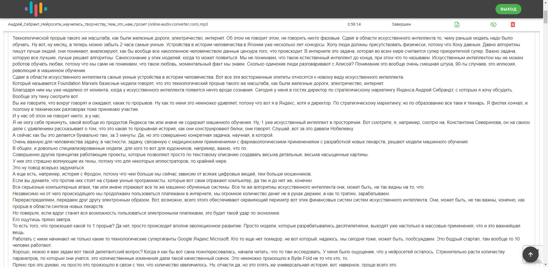 Транскрибация тестового файла стоила 522 рубля (58 минут), обработка файла заняла 6 минут.