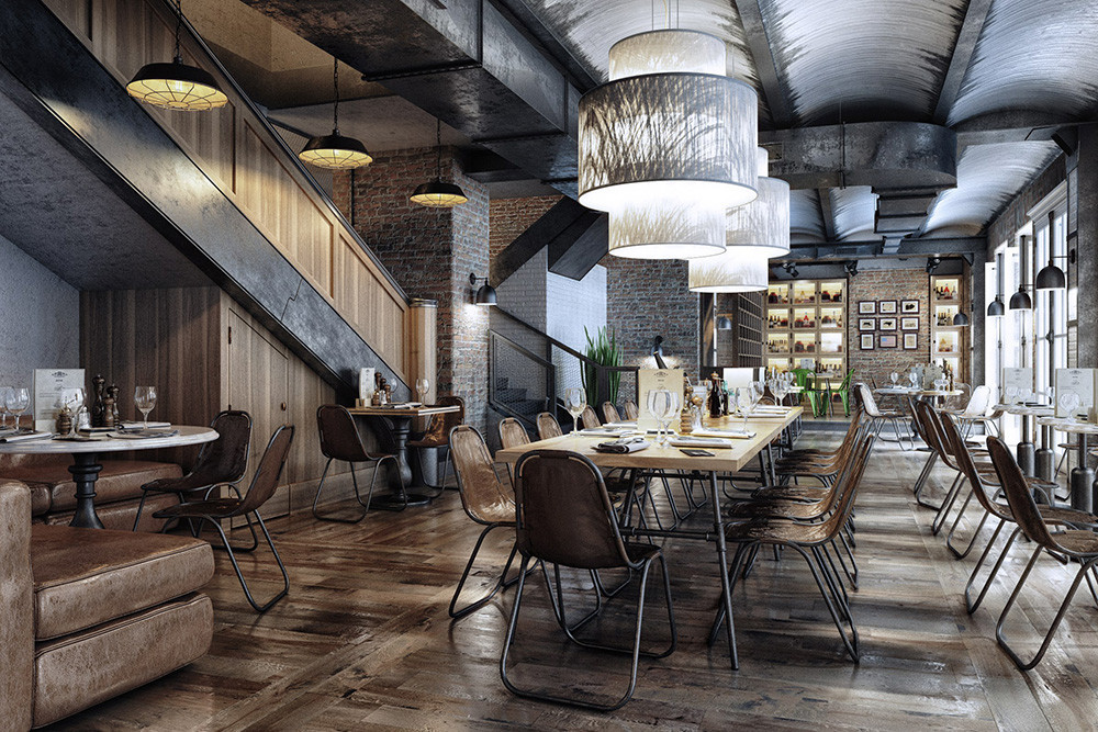- Мебель для ресторана: массивные столы из бетона, металлические стулья, барная стойка из натурального камня