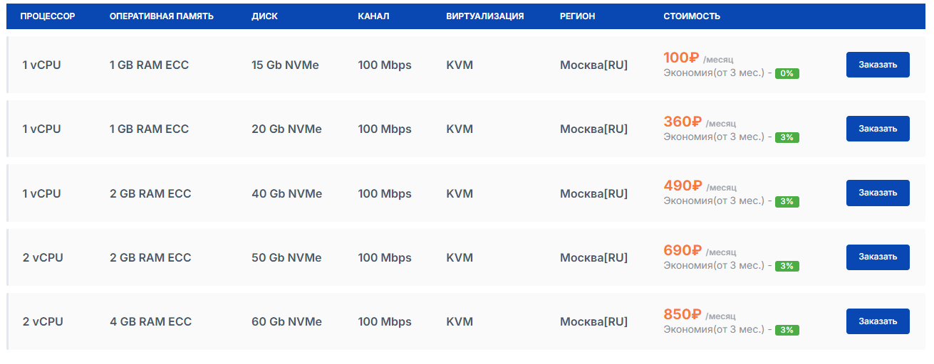 Услуги предоставляет в ДЦ 3Data. Минимальный тариф от 100 рублей в месяц в конфигурации 1/1/15ГБ.