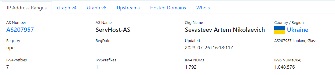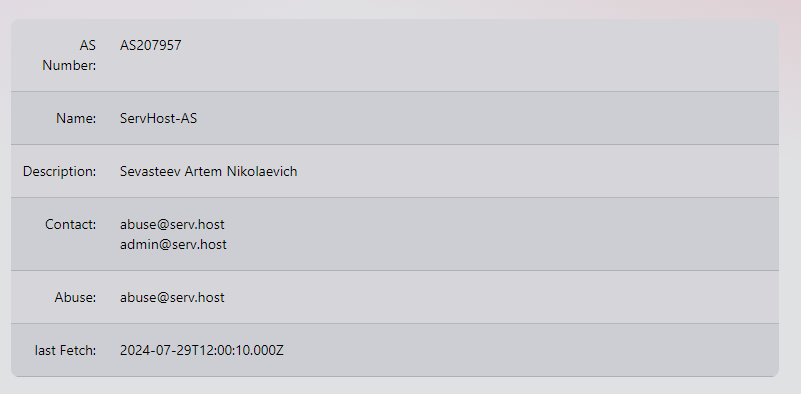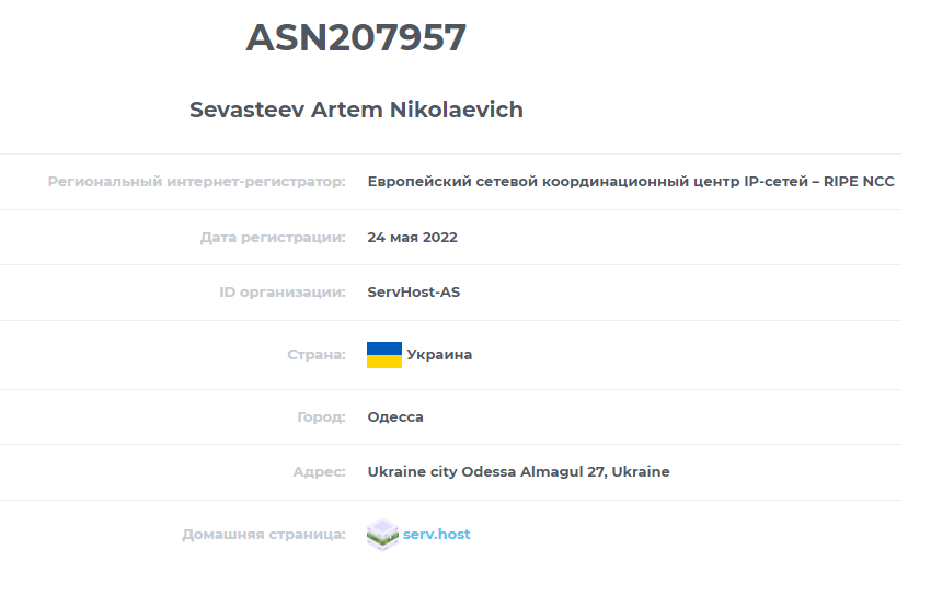 Хостинг Serv Host предоставляет ИП Артюхова А.Д., г. Калуга от 17.01.2024г. Однако домен был зарегистрирован в августе 2019 года, возможно ранее так же предоставлялись услуги хостинга, но без участия ИП. На сайте указано, что это Serv.Host GROUP, но кто еще входит в данную группу компаний не ясно, информации в открытом доступе нет.