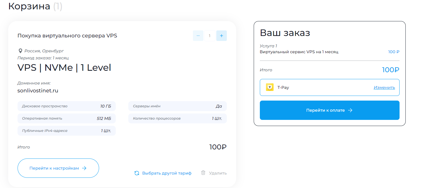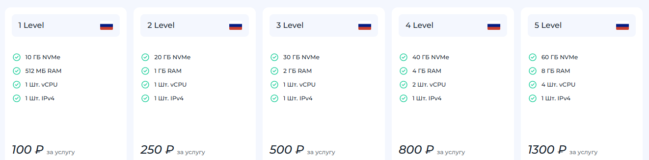 Для теста взял тариф 1 Level (1 ядра/0,5 ГБ память/10 ГБ диск) минимальный тариф.