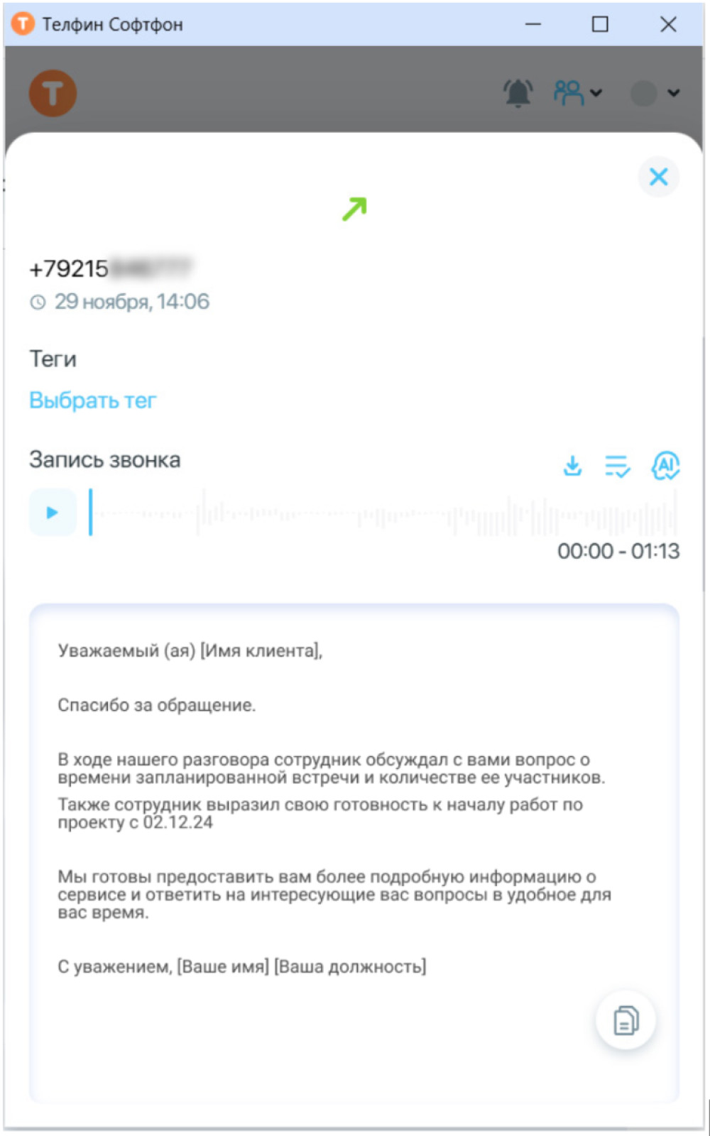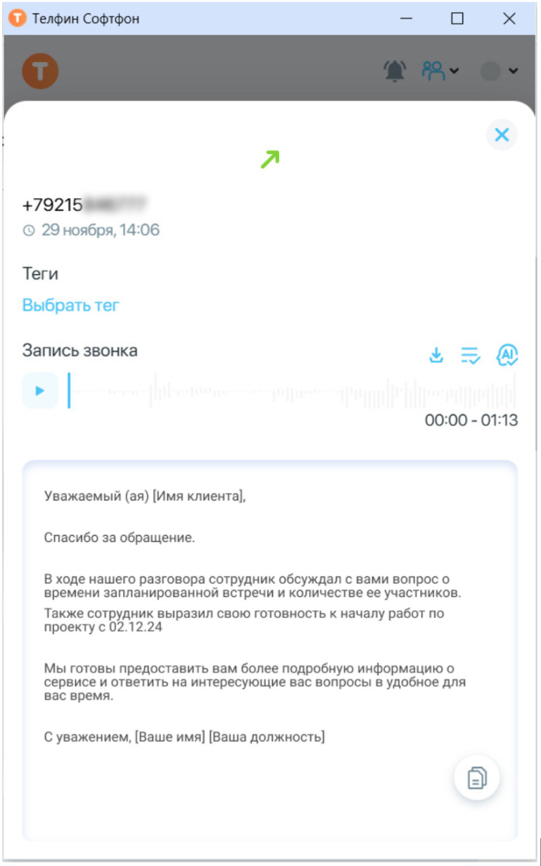Алгоритмы работы нового сервиса позволяют определять темы разговоров, выделять основные вопросы и подводить итоги делового общения по телефону и в мессенджерах. Сразу после звонка система автоматически анализирует диалоги с помощью нейросети и формирует резюме с затронутыми в беседе темами и результатами обсуждения в виде готового проекта письма, которое можно скопировать и направить.