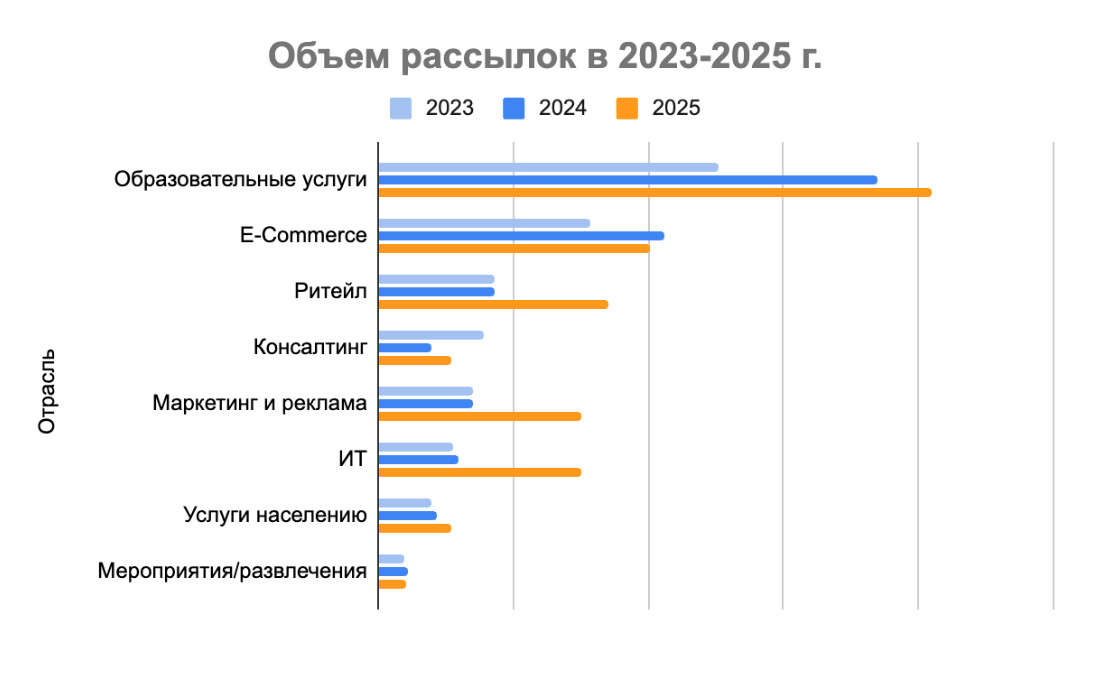 - В 2025 году количество рассылок выросло на 39%. Они приобрели информационно-сервисный характер. Компании в буквальном смысле «ведут» своих клиентов.