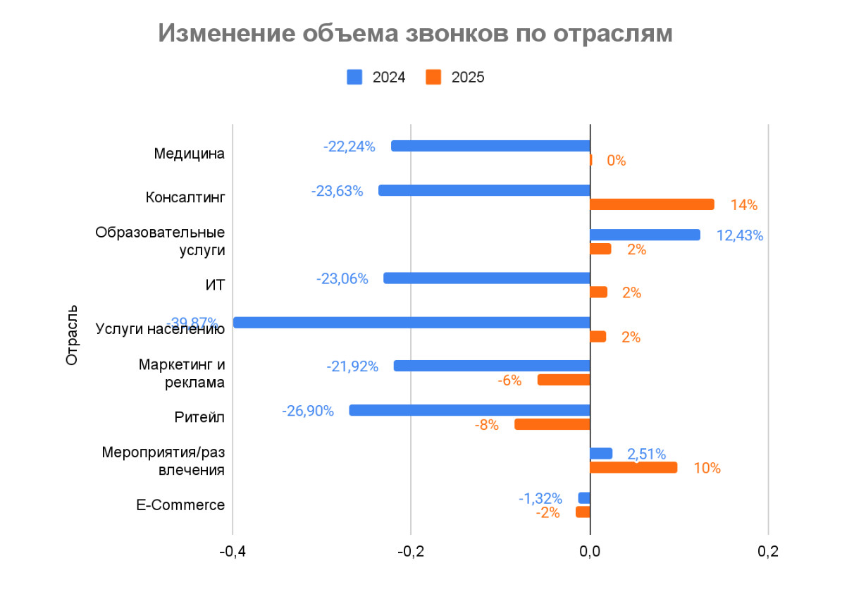 Исследование проводилось среди компаний среднего и малого бизнеса за период с 2023 по 2025 гг. Из базы клиентов «Телфин» были выбраны организации, активно ведущие исходящие обзвоны. За основу взяты обезличенные данные по телефонии, email-маркетингу и показатели конверсии в различных отраслях бизнеса. Наиболее заметные тенденции в коммуникациях с клиентами были выявлены среди компаний из следующих отраслей: e-commerce, образовательная сфера, консалтинг, развлечения, маркетинг и медицина.
