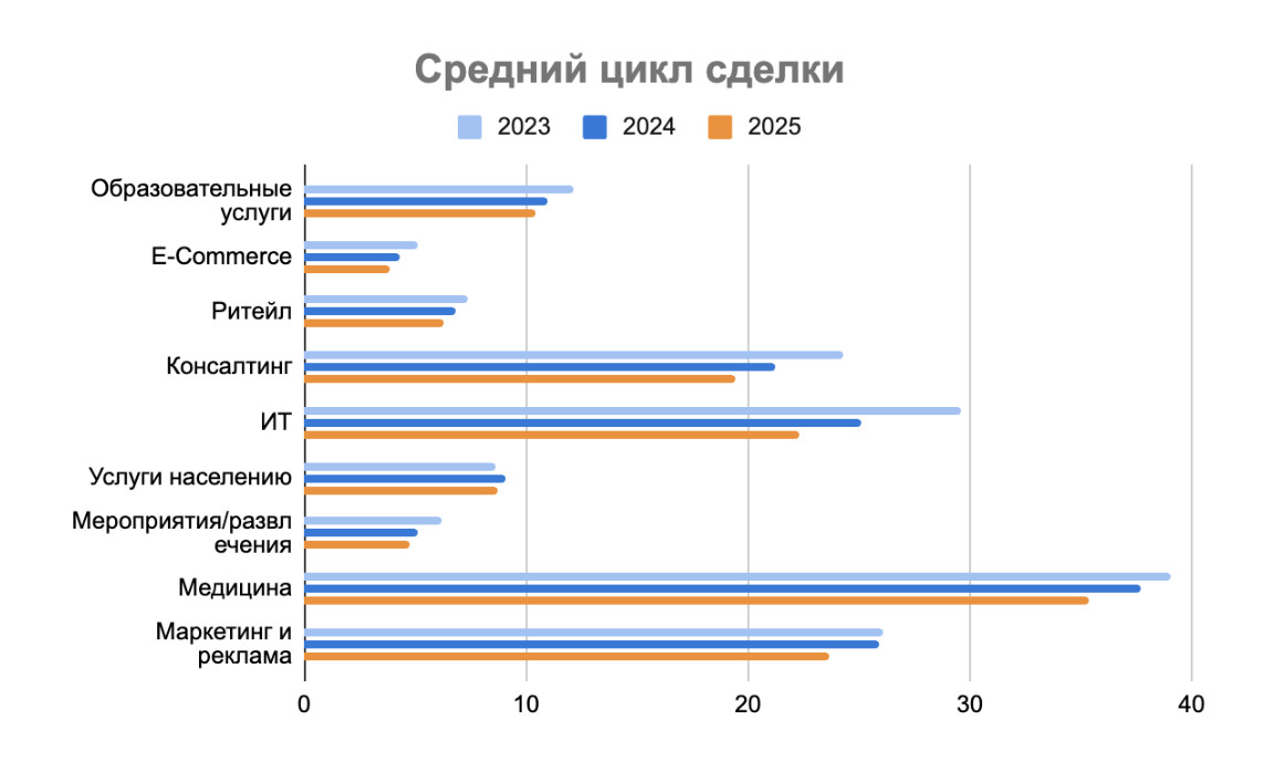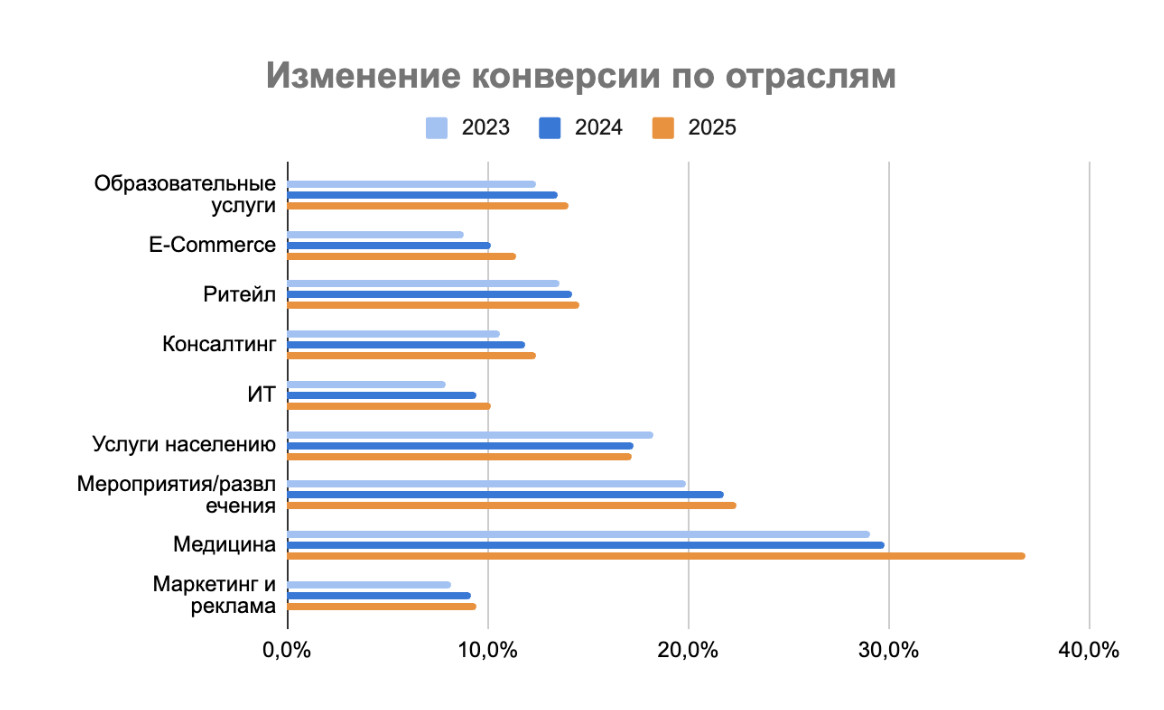 «В условиях высокой конкуренции привлечь новых покупателей становится всё сложнее и дороже, поэтому бизнес начинает смещать фокус с лидогенерации на CRM маркетинг и концентрируется на сохранении тех, кто уже знаком с брендом. Использование информирующих и сервисные рассылок в сочетании с анализом данных из CRM позволяет более адресно обращаться к аудитории и повышать ценность и полезность коммуникации в глазах клиентов, сохраняя покупателей и увеличивая их пожизненную ценность. На фоне постоянного роста конкуренции на рынке именно повышение лояльность выступает важным фактором для стабильного роста», — комментирует Дарья Левушкина, директор по маркетингу Unisender. В сравнении с 2023 годом, в 2025 году компании стали звонить в среднем на 20% меньше. Наибольшее сокращение объема звонков произошло в 2024 году, в 2025 году показатель оставался практически стабилен. Так, если ранее компания к примеру из медицинского сектора в среднем совершала порядка 99 звонок в день, то сегодня это количество сократилось до 77 вызовов. Но если говорить об эффективности этих звонков, то при анализе конверсии из лида в сделку по всем отраслям, активно использующим телефонию для общения с клиентами, наблюдается рост. Особенно сильно он заметен в медицине. Кроме того на фоне общего сокращения числа звонков в 2025 году три отрасли сохранили рост: бизнес в сфере образования — 2,5%, развлечения и мероприятия — 9,9% и консалтинг — 14%. При этом в сегментах образования и развлечений ощутимый рост количества звонков наблюдался и в 2024 году. Для этих индустрий характерно сохранение голосового общения на высоком уровне, так как важен личный доверительный диалог с менеджером. А для сферы развлечений именно разговор голосом побуждает к импульсивным эмоциональным покупкам. По совокупному количеству звонков в числе лидеров можно выделить консалтинг и образование, а на первое место выходит медицина. «Это обусловлено тем, что все эти сегменты характеризуются высоким уровнем вовлеченности покупателя в процесс выбора, так как он оказывает существенное влияние на жизнь человека или требует значительных финансовых вложений. И медицина, и образование, и консалтинг являются сферами, где доверие, внимание к деталям, экспертиза и профессионализм имеют едва ли не решающее значение при выборе поставщика. И именно голосовое общение в отличии от других каналов коммуникаций помогает выстроить доверительный личный контакт с клиентом», — комментирует Ольга Корнеева, директор по коммерции «Телфин». В сегменте медицины компании на протяжении трех последних лет наиболее активно среди всех отраслей используют телефонию. Однако прироста по числу звонков не наблюдается. Это может свидетельствовать о том, что бизнес приблизился к пику эффективного информирования клиентов посредством телефонии и еще более частые звонки могут восприниматься уже негативно. В сравнении с другими сферами бизнеса в этих сегментах звонят в два-три раза чаще. Для остального рынка характерна тенденция перераспределения общения с клиентами в пользу текстовых форматов коммуникаций: через мессенджеры и чаты. Анализ данных по сделкам и клиентским коммуникациям за последние три года показывает постепенный сдвиг от экстенсивного роста к более управляемой модели продаж. Изменения заметны сразу по нескольким ме