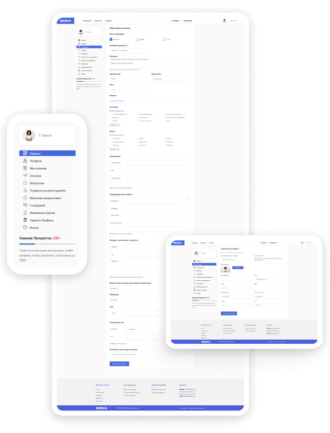 В личном кабинете соискателя на главном экране размещен ряд вкладок: Кабинет, профиль, мое резюме, отклики, избранное, подписка на работодателя, уведомления, сообщения, и системные настройки. На странице «Управление профилем» указывается вся информация о соискателе: ФИО, контактные данные, ожидания от вакансии и многое другое.