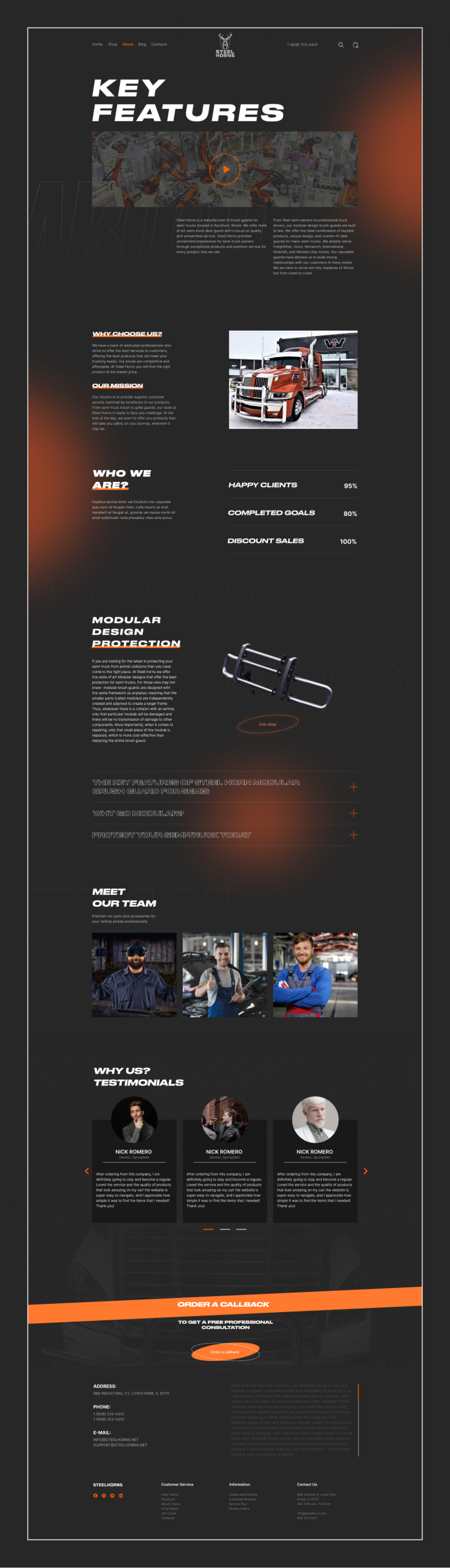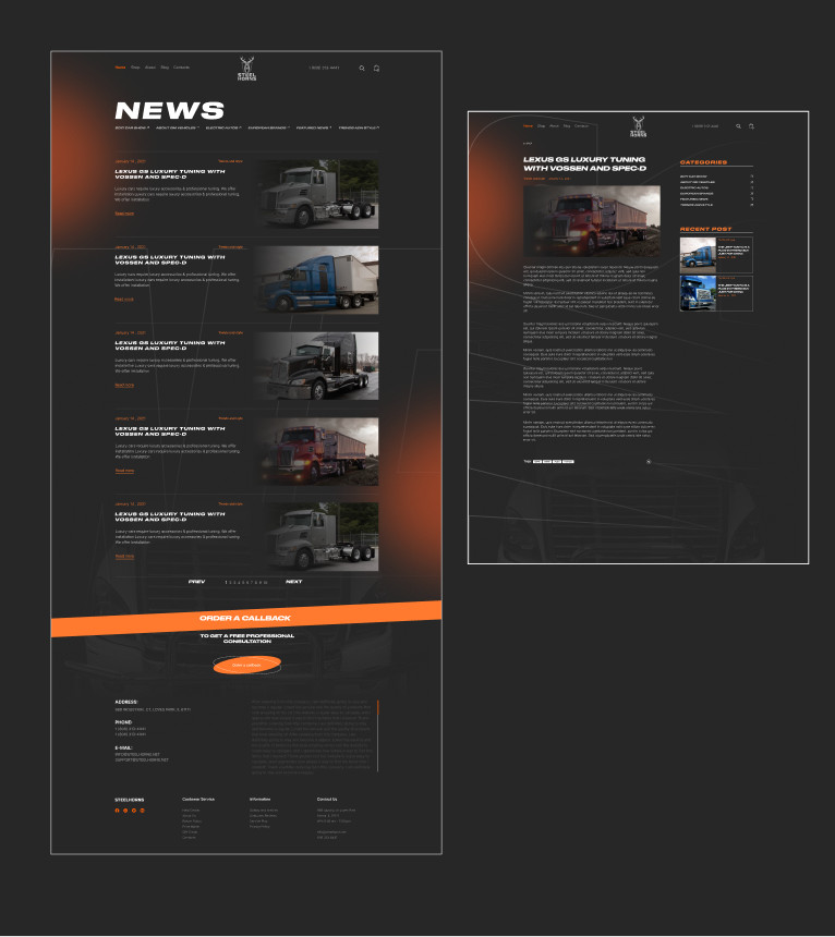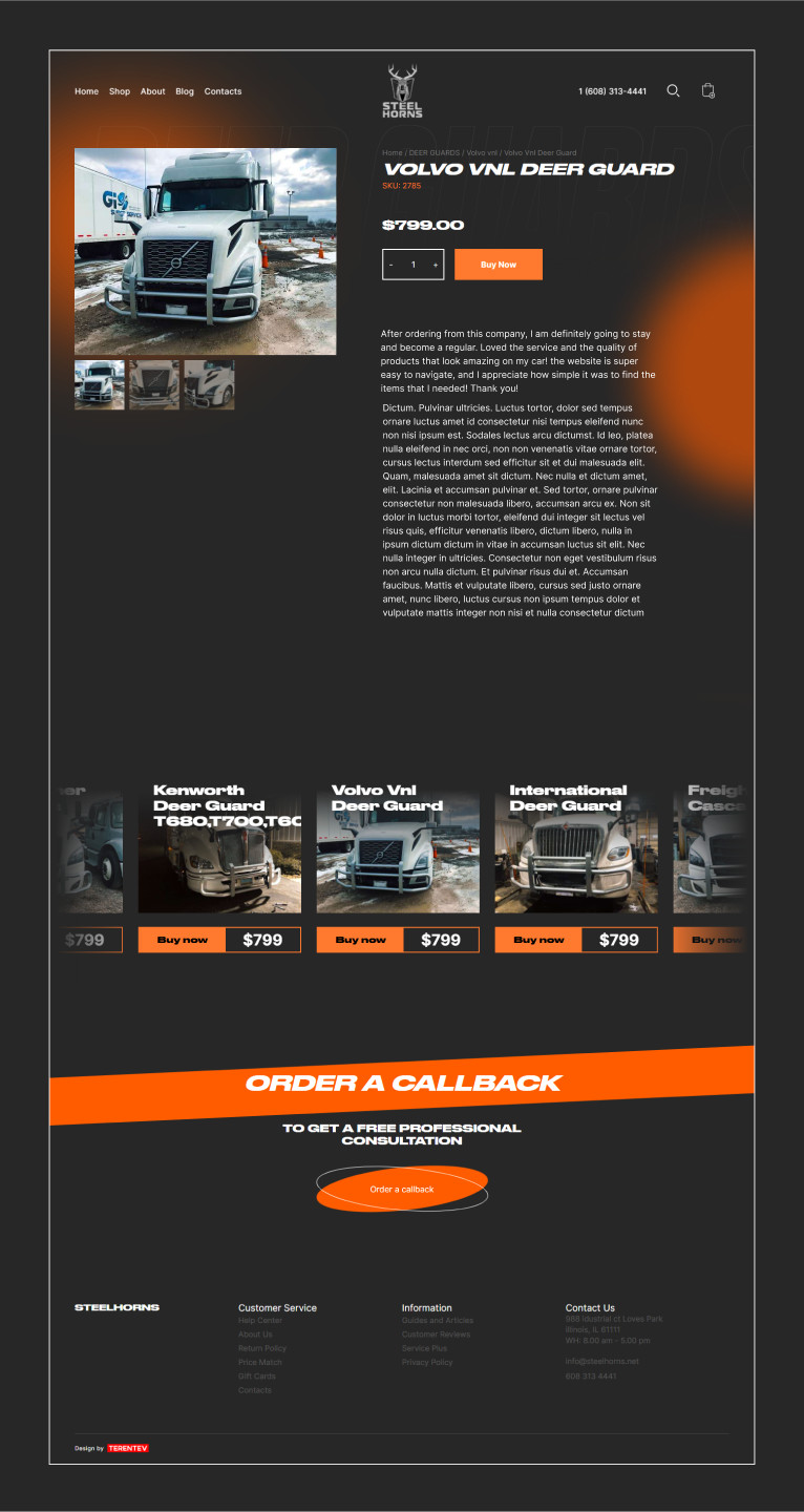 На главной странице в красках описана деятельность компании.Добавлены интерактивные 3D модели и форма поиска по типам грузовиков. Промо страница включает в себя основные разделы сайта, презентации товаров, краткую информацию о компании, шоурил и отзывы.Активная 3D модель точно не даст пользователям заскучать, с её помощью покупатель может с легкостью отыскать интересующую его деталь наведя мышкой на запчасть. Блог и отзывы делают главную страницу веб сайта завершенной, а модуль сео текста встроили так чтобы он не отвлекал внимание и был целостной частью сайта StillHorn производит продукцию на любой вкус и кошелек. Чтобы сделать этот факт наглядным товары распределены по категориям. На страницах нет никаких отвлекающих элементов, поэтому заказчику будет легко ознакомится с товаром и совершать покупки. Чтобы помочь пользователю сделать выбор, на странице продукта можно найти любую интересующую информацию о товаре. Так же, для удобства на страницу выводится список похожих продуктов и запчастей.. На странице размещены промо ролик, внушительное описание и демонстрируются намерения компании. Блог неотъемлемая часть SEO продвижения сайта просто необходима любому интернет магазину, да и в целом блоги недооценивают, трафик который приносят статьи успешно конвертируют новых покупателей. С помощью дизайна, SEO оптимизации анимационных фишек и 3д моделей сайт стал особенным интернет магазином в своей тематике. «StillHorn»- удобный инструмент для продажи защитных решеток для грузовиков. На выходе получился яркий и стильный интернет магазин наполненный разнообразными анимационными фишками и интерактивными 3D моделями. Контрастный визуальный язык поддерживает лаконичные графические решения, делая сайт еще эффективнее в использовании Для любого бизнеса важно быть заметным. Яркий сайт- отличное средство для того чтобы выделятся. Такой ресурс будет не только радовать глаз, а и успешно привлекать потенциальных клиентов.