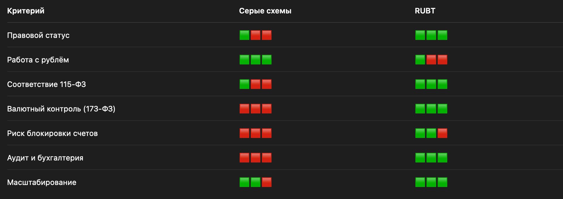 На этом фоне модель RUBT соответствует допустимому регуляторному вектору: она не предполагает расчётов в криптовалюте, не выводит рубль за пределы российской юрисдикции и полностью прозрачна для банковского комплаенса.
