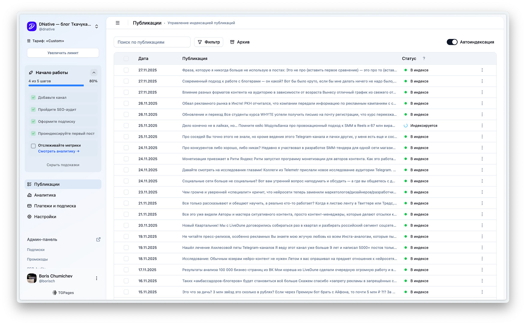 Сервис отбирает из Telegram-канала публикации, которые подходят для продвижения в поиске и публикует их в специальном разделе на сайте TGPages. При этом для каждой публикации с помощью ИИ генерируются: человекочитаемый URL, заголовок и описание (HTML-теги title и description), семантическая разметка Schema.org, Twitter Cards, Opengraph. ИИ также «отсмативает» медиафайлы и генерирует для них описание (теги caption и атрибуты alt). Всё это нужно для индексации роботами и корректного отображения материала на страницах поисковой выдачи. Опубликованные веб-страницы с контентом Telegram-канала сервис отправляет на индексацию в поисковые системы и через некоторое время контент появляется в поисковой выдаче. Теперь, когда пользователи находят публикацию канала через поисковые системы, им будет предложено открыть её в приложении Telegram. Таким образом, канал получает возможность сконвертировать поисковый трафик в читателей и подписчиков. Сервис предоставляет расширенную аналитику и в личном кабинете автор может отслеживать полную воронку эффективности: просмотры страниц с контентом канала, переходы в Telegram-канал и количество подписчиков, которых привел поиск. Также можно оценить, какие материалы лучше ранжируются в поиске. В скором времени мы планируем расширить аналитику и предоставлять такие дополнительные метрики как показы в поиске, среднюю позицию в поиске и топ ключевых запросов. Сегодня TGPages помогает авторам расти за счёт органики: мы делаем контент каналов видимым для поисковых систем и приводим заинтересованных пользователей прямо в Telegram. С нами уже больше 100 каналов, и каждый день подключаются новые. TGPages используют самые разные авторы: от нишевых блогеров и хобби-каналов до медиа и крупных компаний. Продвижение через инструменты SEO требует времени — обычно поисковикам нужно 3-4 месяца, чтобы начать регулярно показывать контент в выдаче. Но уже спустя первый месяц мы видим результаты: многие каналы получают переходы из поиска и первые подписки из органики. Мы развиваем сервис, регулярно добавляя новые функции. В последнем релизе появился SEO-аудит: перед подключением можно узнать, подходит ли контент канала для продвижения через поиск, а также получить полезные рекомендации от ИИ. Проверить, подходит ли ваш канал для такого типа продвижения, можно прямо в сервисе. Посмотреть примеры можно по ссылке: Аудит канала Фридайвинг головного мозга | Ольга Маркина и Аудит канала DNative — блог Ткачука про SMM. Если вы ведёте канал и ищете новые способы эффективного продвижения — попробуйте TGPages по промокоду SPARK (-20% на подключение к подписке от 6 месяцев для первых 50 авторов). Пишите в комментариях, как вам идея продукта и будет ли он вам полезен?