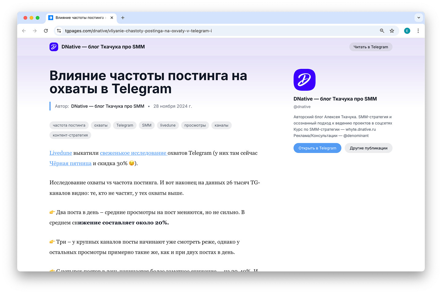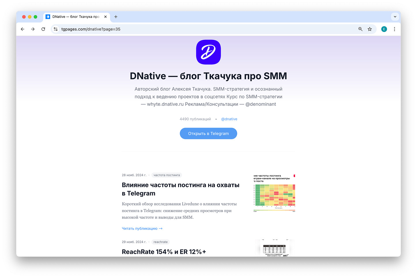 TGPages создаёт для канала раздел с уникальным URL, чтобы индексировать его в поисковиках. Например, для канала @dnative будет создан раздел https://tgpages.com/dnative/