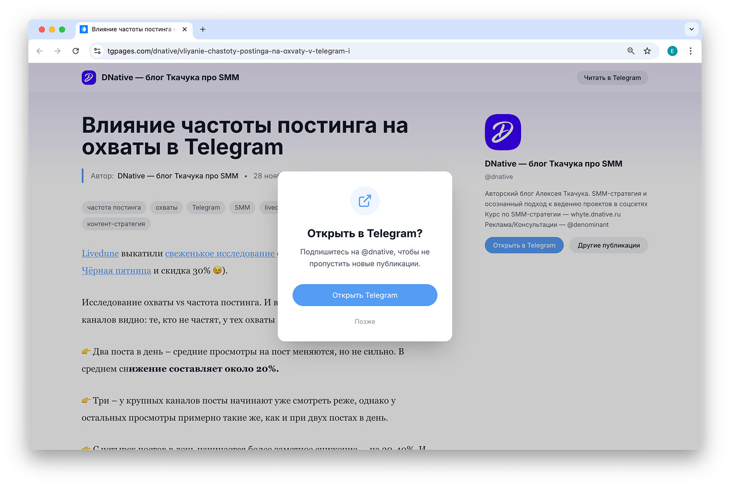 Telegram для авторов контента — как пустыня и дикий запад, здесь нет SEO, нет органики, почти нет рекомендаций. Продвижение канала сводится к покупке рекламы, которая становится всё дороже (а я знаю о чём говорю, так как рекламой в Telegram занимаюсь с самого момента создания каналов в 2015 году). И такое простое и элегантное решение — ну просто глоток свежего воздуха в продвижении в мессенджере.