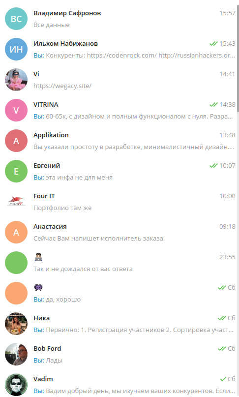 - Ведутся переговоры с вёб разработчиками, много времени уходит на это. Хотим свою платформу для проведения онлайн хакатонов, сдавать в аренду и проводить свои. Ценовая вилка от 60-300 тыс. рублей. Сроки называют тоже разные 12-60 дней. Большинство из подрядчиков являются менеджерами и по всей видимости делают свою накрутку. Ещё есть личности, которых не опознать в телеграм, внизу на скриншоте их видно. К таким нет доверия, по всей видимости они мнят себя хакерами. Все спрашивают ТЗ, у нас получился некий лист вопроса и ответа, он здесь.