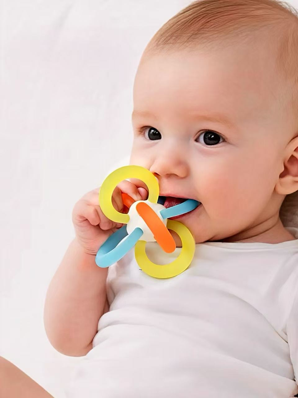 Специализированный прорезыватель с выпуклым рельефом для массажа передних дёсен. Безопасная кольцевая конструкция предотвращает риск травмирования горла.