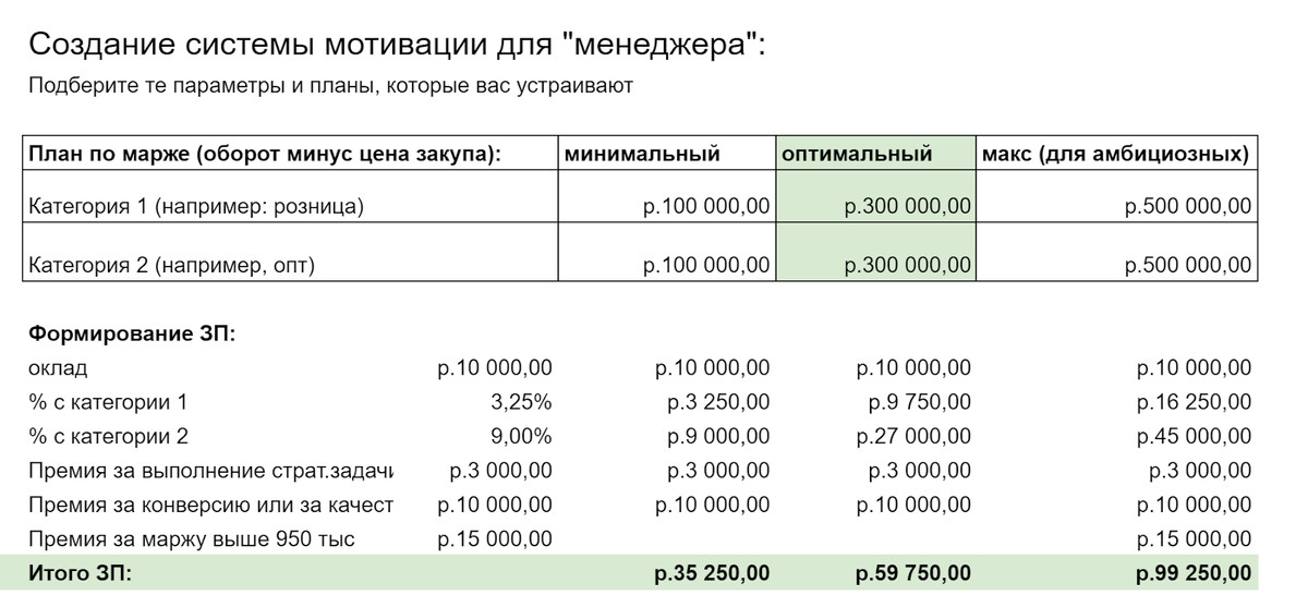 Также и вы для своих должностей определяете нормальную, минимальную и максимальную зарплату для сотрудника и корректируете показатели в шаблоне: величину оклада, процент с продаж в каждой категории, размер премии за выполнение стратегической задачи и другие премии, чтобы финальная зарплата сотрудников вас устраивала. Вы можете придумать, например, премию «за маржу выше 950 тыс. рублей». Вы вольны придумывать любые премии и другие условия игры, чтобы сотрудник мог зарабатывать дополнительные деньги в вашей компании.