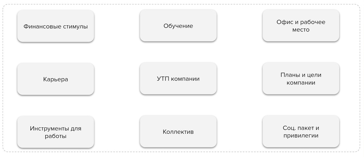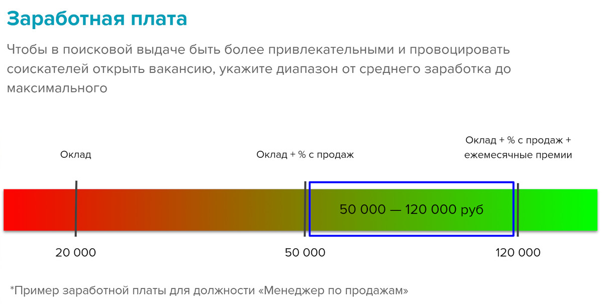 Люди приходят на собеседование и говорят: «Ой, у вас оклад всего 10 или 20 тысяч... Ой, а я хотел оклад 70 тысяч». Для таких соискателей следует приписать в системе мотивации фразу: минимальная гарантированная зарплата на два месяца: 35 тыс. рублей. Или 70 тыс. рублей, или 150 тыс. рублей — все зависит от позиции, на которую вы нанимаете. Иногда это позволяет облегчить для сотрудника вход в вашу компанию. Особенно это касается высокооплачиваемых профессионалов. Можно указывать минимальную зарплату не на два месяца, а на три или четыре. Этот простой подход помогает снимать вопрос с окладом. При этом хочу обратить особое внимание: во-первых, должен быть указан срок — я рекомендую брать все-таки два месяца. Во-вторых, обозначены конкретные условия получения этой гарантированной заработной платы. Обязательно прописывайте условия, выполнение которых потребуется от сотрудника. В противном случае есть большая вероятность, что человек просто сядет на эти 35—70—150 тыс. рублей и поедет у вас на шее, пока через 2–4 месяца ему не подвернется лучшее предложение. А когда все условия прописаны, и сотрудник их не выполняет, со спокойной душой говорите ему: «До свидания». Варианты оплаты могут быть различные: оклад плюс KPI с планом, оклад плюс процент с маржи, оклад плюс ежемесячные премии. Например, если максимальный предел по зарплате — 120 тыс. рублей, то, соответственно, в вакансии вам нужно ставить зарплату от 50 тыс. до 120 тыс. рублей. Если человек реально может получать эти деньги, то эту сумму и нужно обозначить в вакансии. Иногда в вакансиях указывают оклад, который не очень большой. Это снижает конверсию в отклики. Просто не стоит указывать оклад в тексте. А когда вы обозначаете в вакансии нормальные конкурентные рамки заработной платы, то получаете существенно больше откликов. Обязательно указывайте в своей вакансии бонусы, которые человек получит в вашей компании. Бонусы — это неотъемлемая часть продающей вакансии. Обычно выделяют 9 типов бонусов: финансовые стимулы; обучение, которое вы предоставляете; офис и рабочее место; планы и цели компании; коллектив; социальный пакет и привилегии; уникальное торговое предложение компании; карьера и инструментарий для работы. Продумайте, какие бонусы вы можете использовать в своей компании, и напишите их в текстах вакансий. Это улучшит конверсию из просмотра в отклик. Этот и другие полезные шаблоны вы сможете скачать в нашей бесплатной базе знаний https://lk.tothegoal.ru