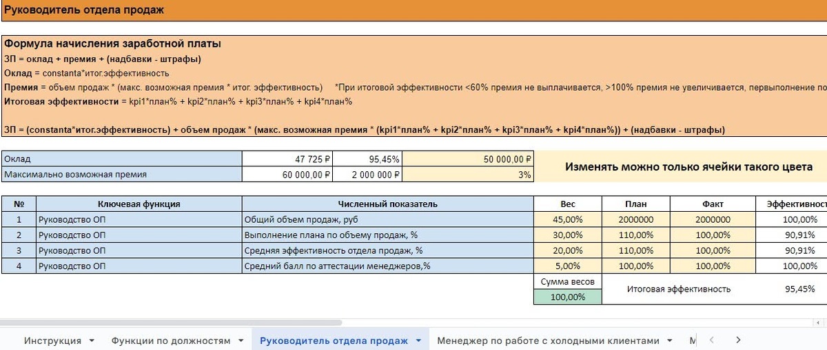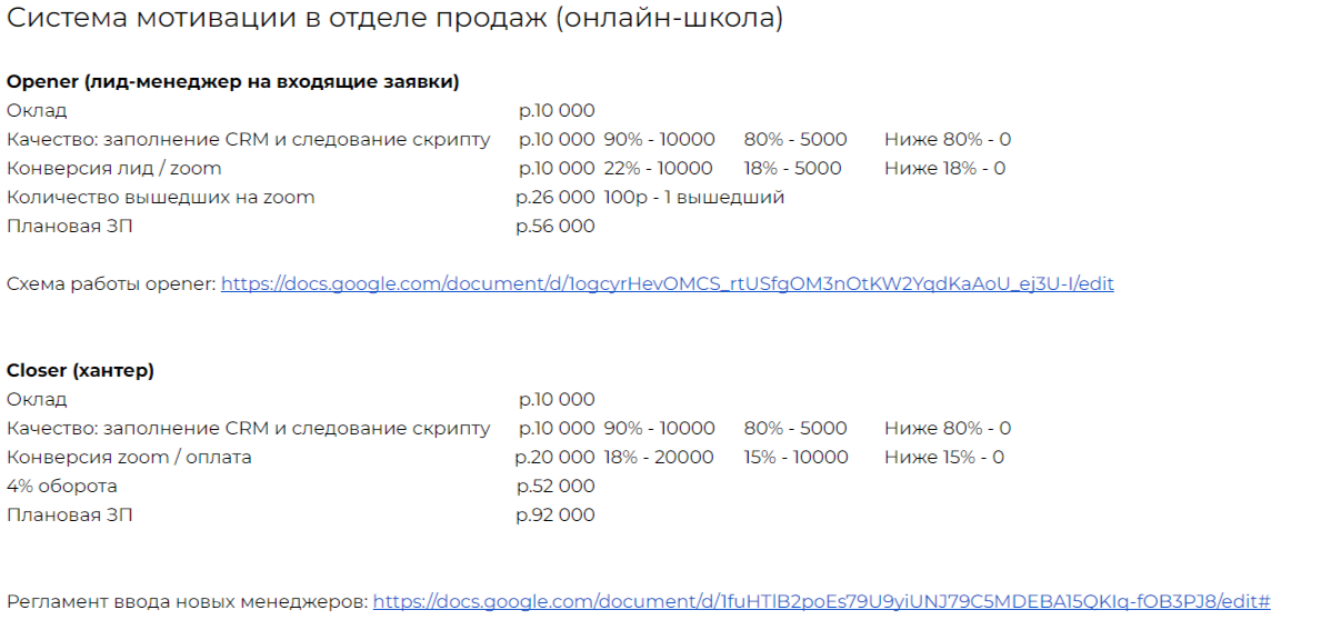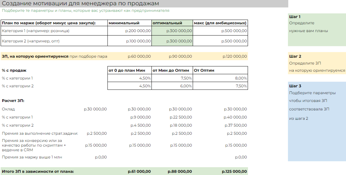 Сейчас вы узнаете о самом простом способе, который покажет, как пользоваться конструктором системы мотивации и как происходит формирование системы мотивации. Вот, к примеру, файл «Создание системы мотивации для менеджера по продажам» и вкладка «Расчет ЗП от планов»: Состоит из трех шагов для того, чтобы сделать финальную систему мотивации работников: В первую очередь, ориентируйтесь на показатели на рынке труда. Можно посмотреть среднюю зарплату по конкретной специальности, например, на hh.ru или других подобных сайтах по поиску работы. Кроме этого, зарплата для сотрудников — это баланс некой скупости владельца бизнеса (экономии затрат) и его щедрости (если вы хотите платить выше рынка). Запишите цифры в колонку «Оптимальный размер зп», затем впишите данные в колонку «Макс.(для амбициозных)». Не забудьте заполнить графу с минимальным размером заработной платы. Обратите внимание, вверху в таблице есть строки с категориями — розница и опт. План по марже (не по обороту) — на это обращайте внимание, это важно. Из таблицы выше видно, что показатели — это проценты, оклад, премии. Это нужно для того, чтобы расчетная зарплата попадала в ЗП, на которую ориентируемся. Например, мы хотим сделать зп — мин. 60 000, опт. 90 000 и макс 120 000 рублей. Затем повысьте проценты и оклад, тогда вы сможете сделать необходимые показатели. Также можно убрать премию за маржу — поставьте «0,00 рублей». Благодаря всем этим хитростям вы установите показатели по зарплате такие, как нужно, чтобы каждый сотрудник получал нужный уровень дохода. Также в этом файле есть информация и про другую систему мотивации в компании. Она находится в файле с названием «Лид-менеджеры и Клозеры»: Есть еще один файл с полным набором KPI всего отдела продаж: Обратите внимание на файл «Руководитель отдела продаж»: В самом первом файле слева (снизу) вы увидите Инструкцию. Ее можно скачать и самостоятельно, не спеша, разобраться во всех нюансах системы мотивации. Вы научитесь правильно заполнять все графы и колонки, рассчитывать показатели и следить за размером ЗП своих сотрудников. Стоит отметить, что система мотивации в компании для других сотрудников составляется также просто, как и для ТОП-менеджеров и т.д. Подробнее о том, как выглядит система мотивации сотрудников в таком случае: Вы определяете ЗП, на которую должен выходить сотрудник, если работает хорошо. Не отлично, а просто хорошо. Берете от 30 до 50% от этой суммы — это и будет оклад. Остальное — переменная часть. В общем, мотивирование сотрудников важно, и в любой компании должна быть выстроена система мотивации сотрудников В этой статье много полезной информации, в особенности, если вы — руководитель компании или ее владелец. Посоветуйте прочтение этой информации своим знакомым, которым нужно разработать систему мотивации Не забывайте, что есть еще другая система мотивации — санкции. Об этом написано в следующей статье, обязательно изучите эту полезную информацию. Этот и другие полезные шаблоны вы сможете скачать в нашей бесплатной базе знаний https://lk.tothegoal.ru