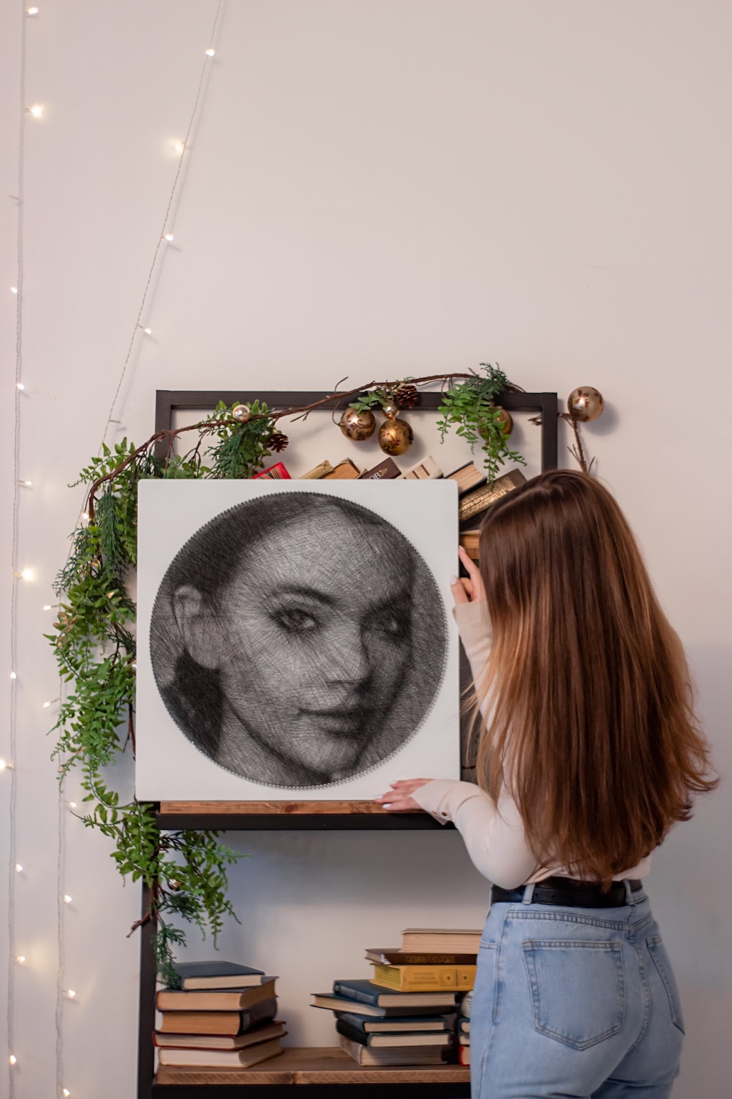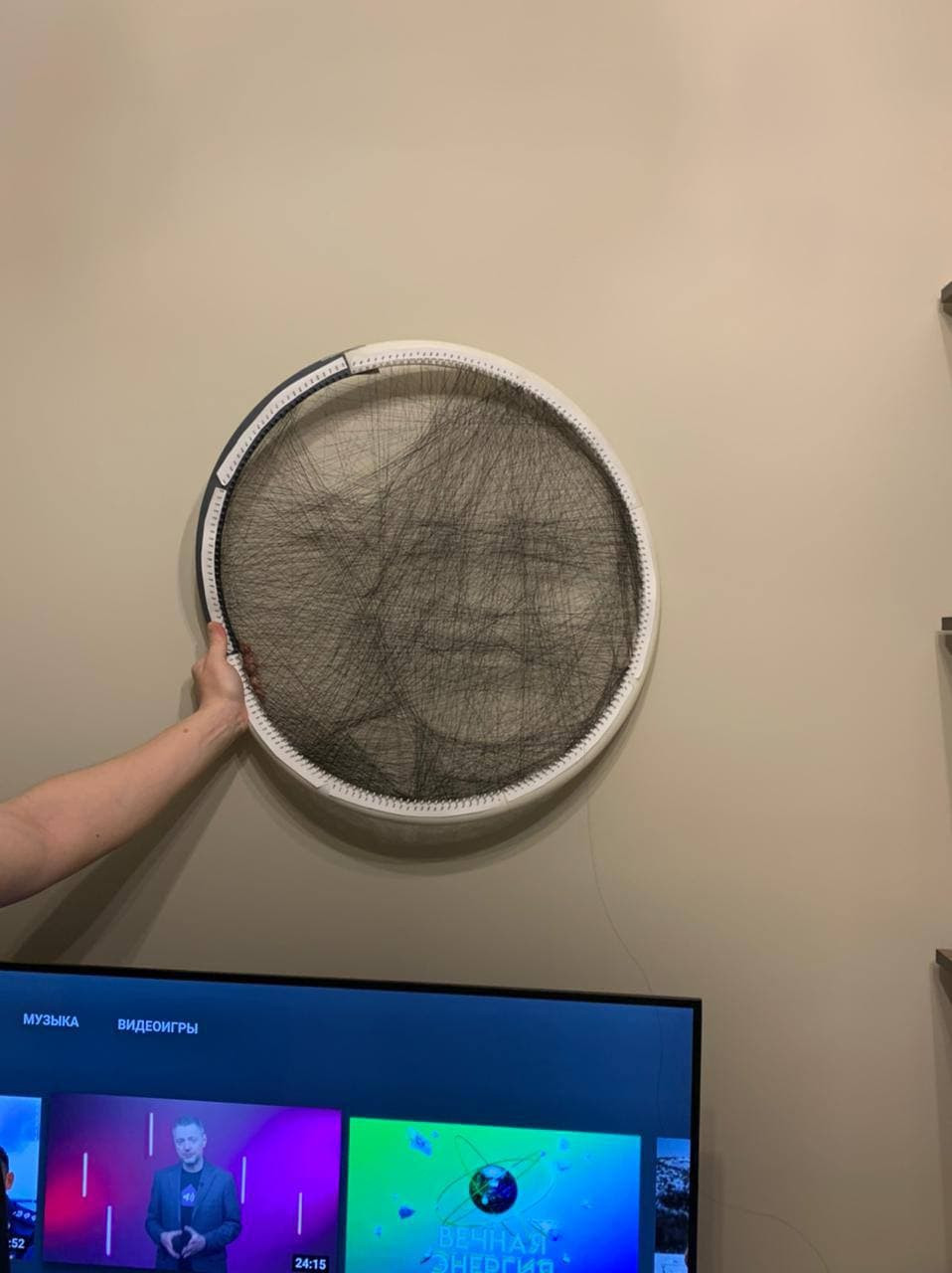 Сейчас с каждым днём всё популярнее становится стринг арт. Так называют творчество, когда картины собираются из одной непрерывной нити. Надо цеплять нитку за гвозди и постепенно, шаг за шагом, получается картина.