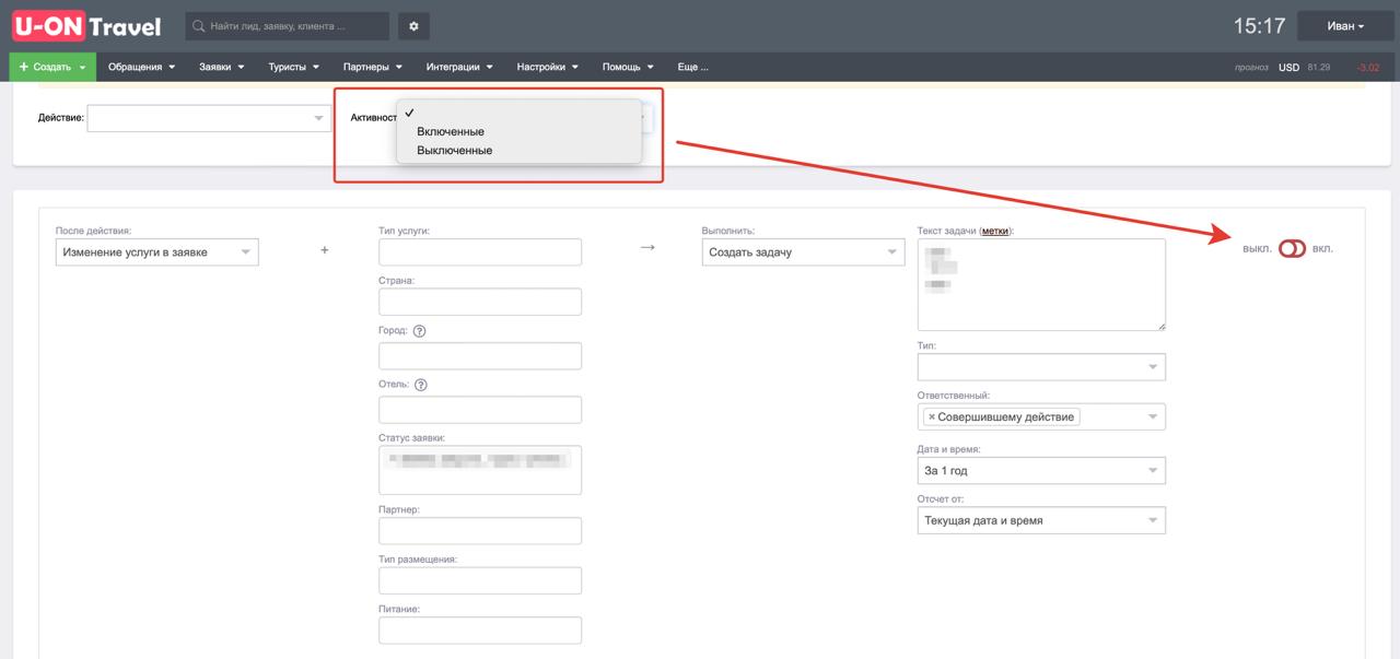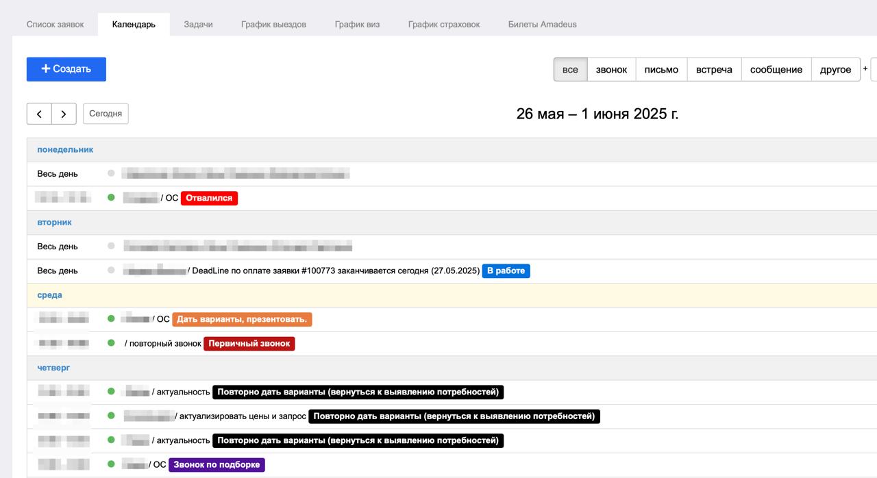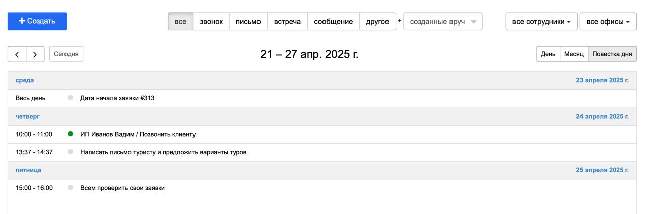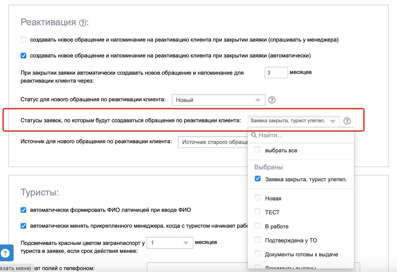 31.03.2025. Добавили информацию с привязанными курсами валют у поля «Туроператор» в заявке + при изменении основной валюты в заявке система теперь автоматически ставит курс валют привязанного туроператора в услугах (см. видео: https://t.me/uontravel/1414). 03.04.2025. Если у вас фискальный чек остался без привязки к платежу, то теперь вы можете его привязать к новому платежу самостоятельно (раздел «Финансы — Фискальные чеки»), (см. видео: https://t.me/uontravel/1417). 04.04.2025. Добавлена интеграция с сервисом подписи документов F.Doc (раздел «Интеграции — Онлайн-подпись документов — F.Doc»). Ссылка на видео: https://rutube.ru/video/b7285074649247871ed59e359edef566/ 09.04.2025. Добавили фильтрацию по активности (вкл/выкл) в разделе «Автоматизации бизнес-процессов» («Настройки — Дополнительно — Автоматизации бизнес-процессов»). 10.04.2025. В раздел обращений и заявок мы добавили возможность вывода столбца «Кто привел?» (показывает клиента, который привел клиента по обращению/заявке). 17.04.2025. Банковские реквизиты вашей компании мы перенесли в отдельную вкладку. 18.04.2025. Если вы указали несколько банковских счетов для своего юр.лица, то при создании безналичного счета теперь можно выбрать реквизиты, которые появятся в печатной форме счета. 24.04.2025. Мы полностью переработали календарь с задачами и добавили режим «День» с разбивкой по менеджерам + режим «Повестка дня», где вы можете увидеть список задач на неделю по дням. 29.04.2025. В список туроператоров с курсами валют добавлен туроператор «Миракль» (раздел «Еще — Финансы — Курсы ТО»). 06.05.2025. Наша команда U-ON.Travel рада сообщить о начале сотрудничества с Российским университетом дружбы народов (РУДН). 07.05.2025. Для полей с периодом по датам мы добавили возможность выбрать «сегодня» / «вчера» / «текущий месяц» / «текущий год» и «прошлый месяц» с «прошлым годом». 08.05.2025. В настройки личного кабинета туриста добавлена настройка, которая скрывает время вылета и прилета (раздел «Настройки — Дополнительно — Личный кабинет туриста»). 10.05.2025. Теперь можно спрятать любую заявку из личного кабинета туриста — с помощью этого значка. 12.05.2025. Для запрета на изменение контактных данных у туристов мы добавили отдельное право доступа. 13.05.2025. В список вебхуков добавлены новые пункты (раздел «Интеграции — API/Webhooks» и «Настройки — Дополнительно — Автоматизация бизнес-процессов»). 15.05.2025. Мы обновили приложение U-ON.Evotor для онлайн-кассы Эвотор. Теперь повторные чеки печататься не будут и статус печати обновляется постепенно — сначала «В ожидании ...», а потом «Успешно напечатан». 16.05.2025. Наша команда U-ON.Travel рада сообщить о начале сотрудничества с Финансовым Университетом при правительстве Российской Федерации. 19.05.2025. В расширенный поиск раздела «Заявки» добавлены фильтры по валюте — отдельно по блоку с клиентом и по блоку с партнерами. 20.05.2025. Теперь для реактивации клиента можно указать несколько статусов по заявке. Раньше по-умолчанию был один статус «Заявка закрыта» (раздел «Настройки — Дополнительно — Система», блок «Реактивация»). 21.05.2025. Полностью изменен механизм срабатывания напоминаний — теперь напоминания по задачам срабатывают в ту же минуту, на которую они были установлены. 22.05.2025. В разделе «Заявки — График выездов» добавлен пункт, который отображает все перелеты внутри одной заявки, а не только начало и окончание заявки. 28.05.2025. Мы добавили новое право доступа для поля «Номер сче
