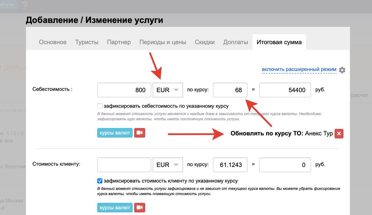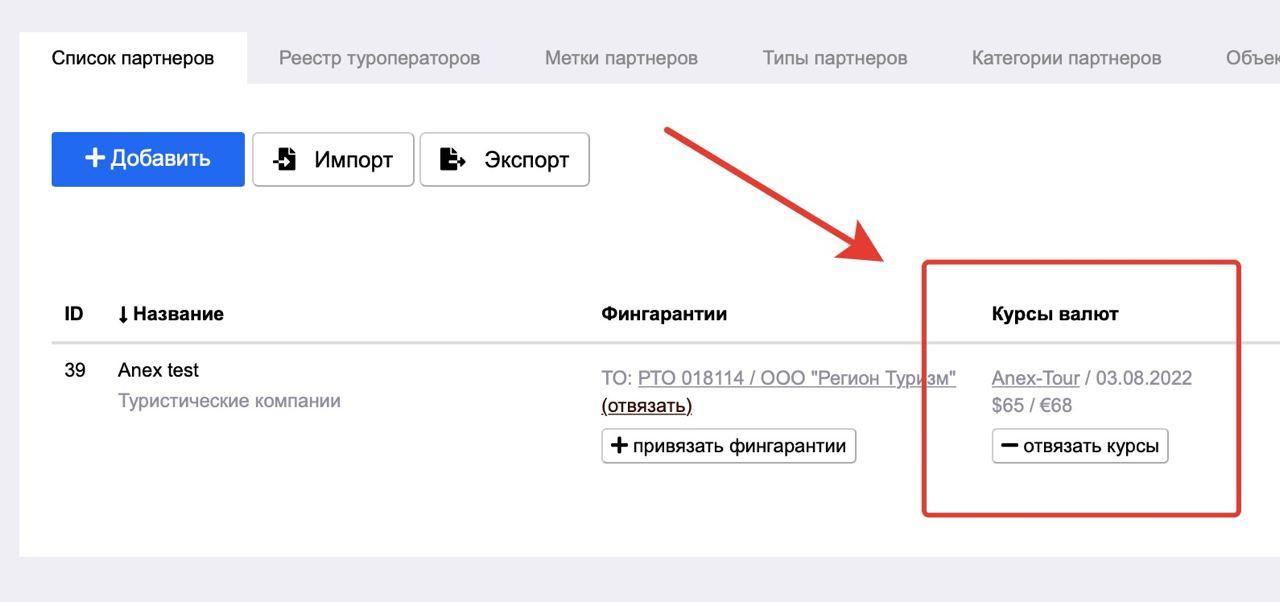 3.08.2022. Мы добавили возможность привязки курсов валют туроператоров (которые загружаются в нашу систему с сайтов) к нашей сущности партнера. Система автоматически будет подгружать курс валюты выбранного туроператора при создании услуги или платежа (видео по ссылке: https://youtu.be/oIxgUxe6PYc).