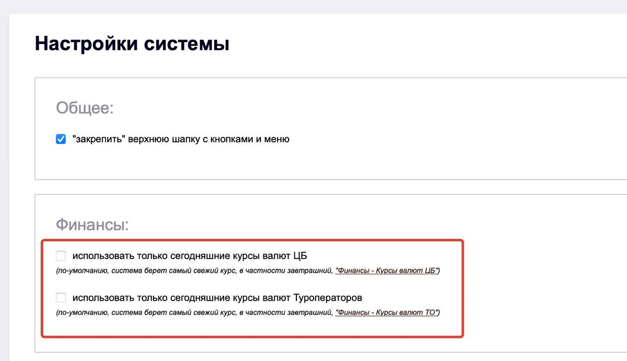 13.09.2022. Добавили новые настройки в разделе «Настройки — Дополнительно — Система» для использования только сегодняшних курсов валют центробанка и туроператоров. По-умолчанию, система использует и завтрашний курс, если он уже был выгружен с сайта центробанка или сайта туроператора.