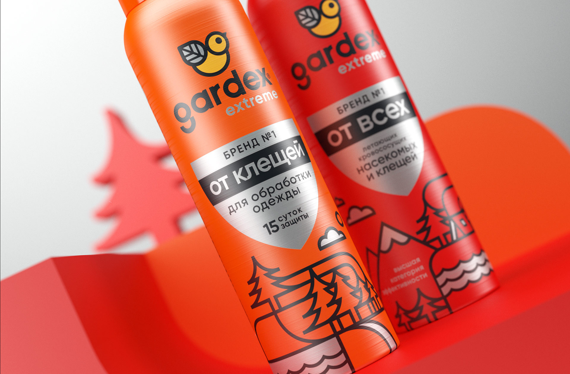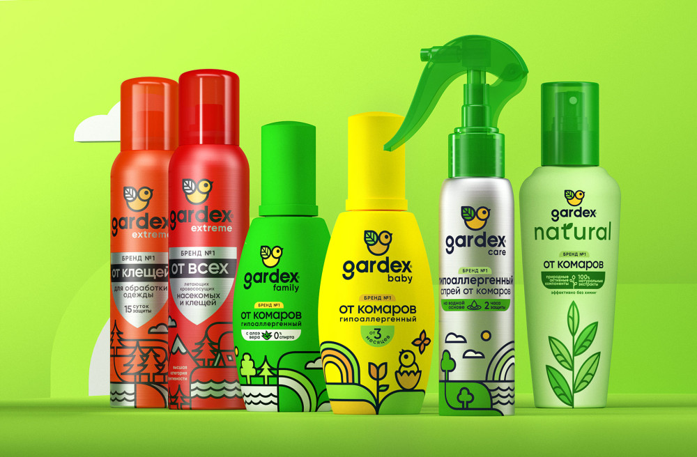 Логотип был также переработан в соответствии с последними шрифтовыми трендами, стал еще более геометричным. Это же касается и «птички» — более толстый и геометричный контур, гармоничное сочетание толщин. Компактный блок в центре концентрирует всю главную информацию о продукте, здесь все структурировано и понятно потребителю. Плоский стиль во всем: в иллюстрации, в клеймах, в лого. Экстремальная линейка сохранила ключевой элемент — щит, символ надежной защиты. Для GARDEX NATURAL в этом же стиле была изображена веточка. В результате GARDEX предстал выверенным, цельным, обновленным, сохранив всю иконичность, и, несомненно, прибавил в уникальности и премиальности.