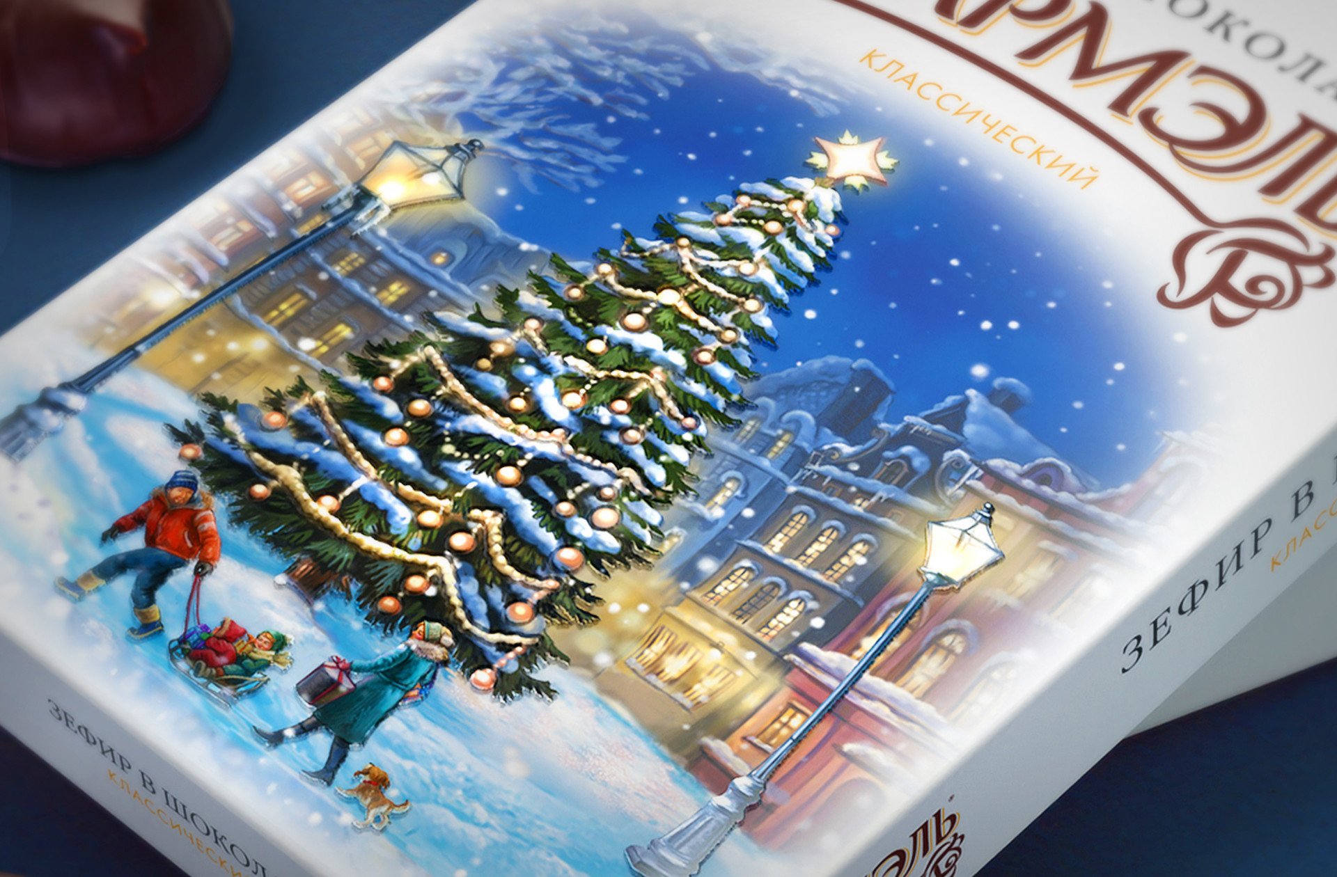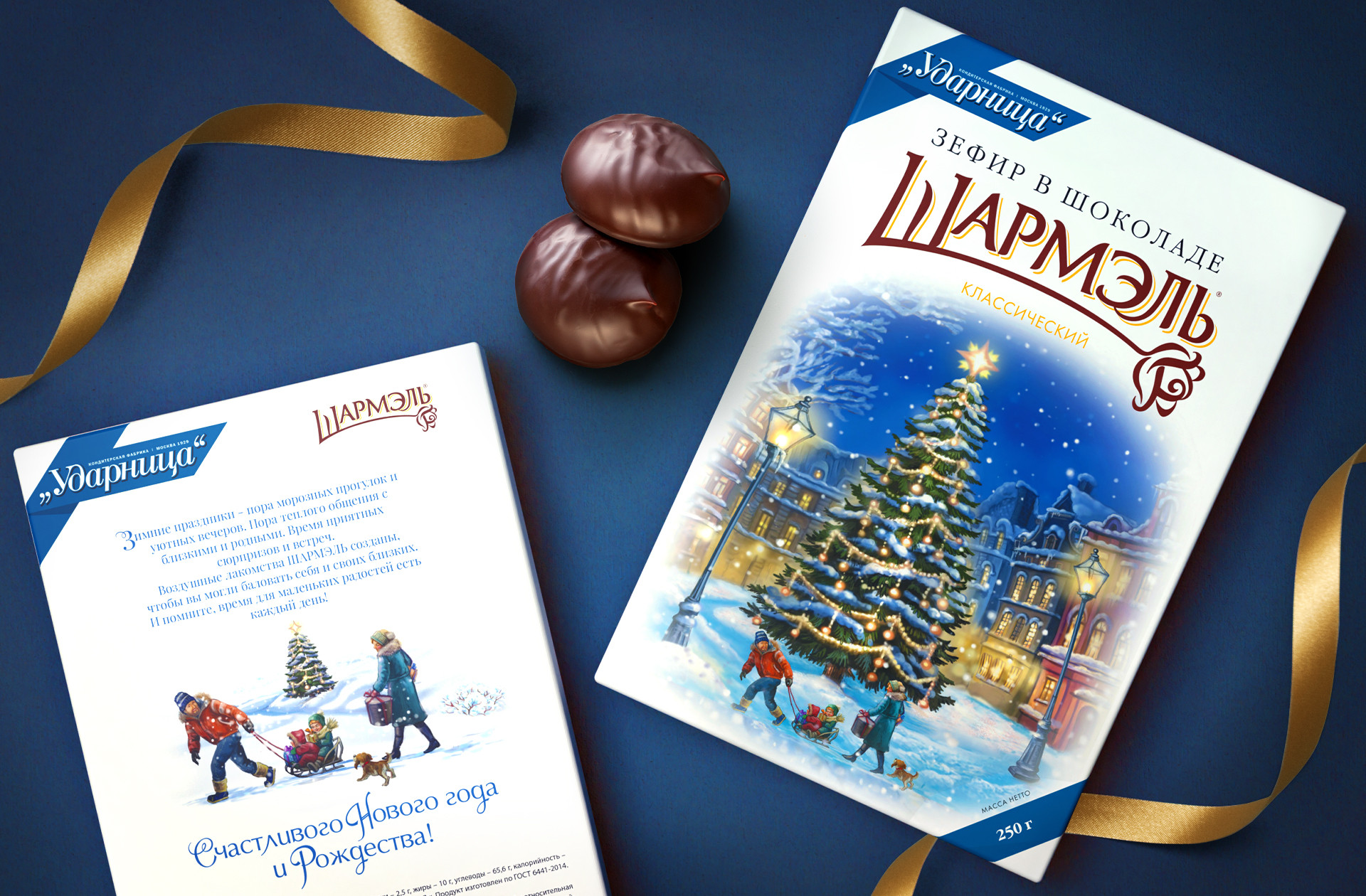 Наш клиент, кондитерская фабрика «Ударница», каждый год выпускает упаковку Зефира в шоколаде с праздничным дизайном, чтобы усилить присутствие бренда «Шармэль» на рынке в предновогодний сезон, привлечь внимание покупателей и создать более глубокую эмоциональную связь с потребителем. У бренда высокое знание марки, поэтому важно сохранять узнаваемость упаковки и максимально сохранить логоблок. Фактически вся коммуникация идёт через иллюстрацию.