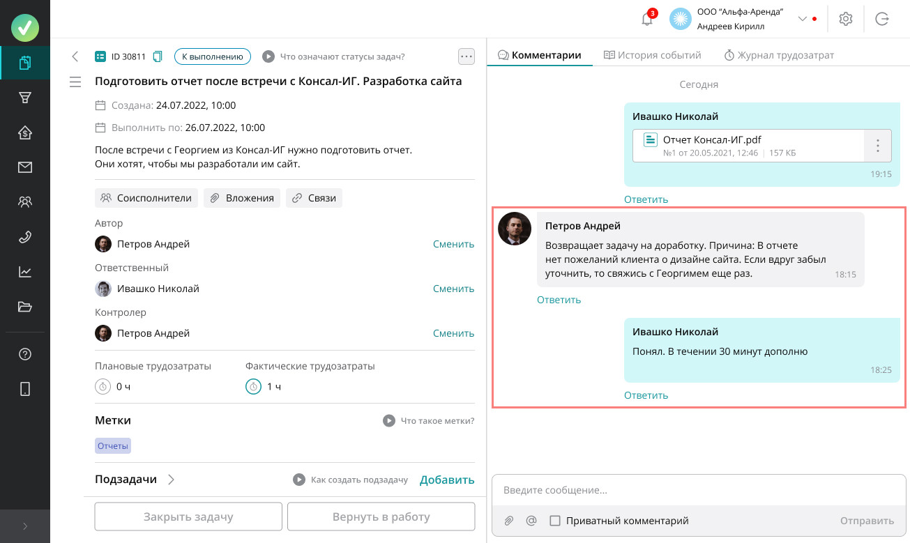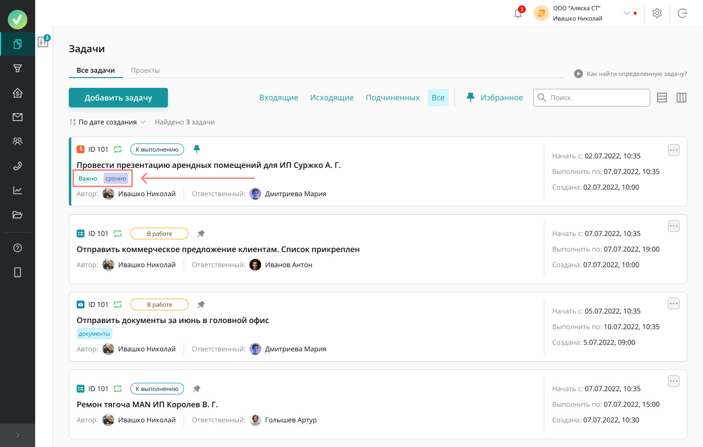 Пока он все это уточнит, то потратит и свое время и время менеджера. Из-за отсутствия подробностей в описании задачи секретарь может не рассчитать сколько требуется время на задачу и выполнить ее с опозданием, а также может забыть или перепутать информацию, если будет спрашивать подробности, например, по телефону, запоминая их «на слух». В итоге выяснится, что секретарь перепутал адрес доставки или забыл вложить нужный документ в конверт. А теперь посмотрите, как меняется ситуация, если описание к задаче написать подробно: "Собери пакет документов за июнь: Договоры аренды со съемщиками помещений Договоры на размещение рекламы Акты выполненных работ с подрядчиками Оригиналы заявлений сотрудников на отпуск Заполненные путевые листы от водителей Отправить нужно в головной офис. Получать будет Виктория Осипова — главный бухгалтер. Курьерская служба DPD (менеджер Виталий После прочтения такой подробной инструкции (описания задачи) сотруднику все понятно и он приступает к работе над ней. Правило 3. У задачи обязательно должен быть конечный срок ее исполнения. Без дедлайна невозможно контролировать исполнение задачи. Например, у отдела по работе с клиентами 30 активных задач без конечного срока выполнения. Из-за отсутствия конкретных дедлайнов руководителю сложно понять, когда сотрудник выполнил работу и оценить его продуктивность или наоборот, почему до сих пор задача не сделана. Сотруднику не ясно, когда приступать к выполнению и к какому числу нужно успеть завершить задачу. Устанавливайте реальные сроки выполнения — дедлайны. Реальные сроки — это время, к которому сотрудник должен успеть выполнить всю работу. Нужно учиться работать с дедлайнами, чтобы в итоге задачи выполняли вовремя. Нужно учиться самому и обучать тех, с кем ты работаешь вместе, устанавливать дедлайны, которые реально выполнимы. Что такое «учиться работать с дедлайнами»? Это не просто «я поставил и вы должны сделать». Представьте мастера по установке кондиционеров. У него загрузка на неделю вперед. В компанию обращается новый клиент, и менеджер ставит задачу на срочную установку, когда у мастера итак большая загрузка. Нужно понимать, что у мастера уже есть работа, прежде чем ставить дедлайн новой задачи. Вы всегда можете посмотреть загрузку сотрудника по задачам и исходя из этого устанавливать сроки исполнения новой задачи. Если вы понимаете, что для компании очень важно установить кондиционер новому клиенту, но мастер никак не может из-за загрузки, то поменяйте ему приоритеты и сроки в других задач. Например, если текущий клиент может подождать, отложите установку на пару дней, а в освободившиеся дни — мастер поедет на «срочную установку» к новому клиенту. Правило 4. Используйте метки для установки приоритетов задачам, а также для добавления дополнительных статусов. Например, «Срочно», «Отправить прайс», «Email-рассылка». Когда в компании 100500 задач именно метки помогают сотрудникам ориентироваться по списку и фильтровать необходимые задачи. Благодаря меткам, сотрудники понимают приоритет задачи, которую нужно выполнить. Если пришло две задачи, а у одной из них стоит метка «Срочно», значит именно эту задачу нужно брать в работу первой. Правило 5. Укажите сотруднику, какой вы ожидаете от него результат работы. Примеры могут быть следующие: Например, в зада