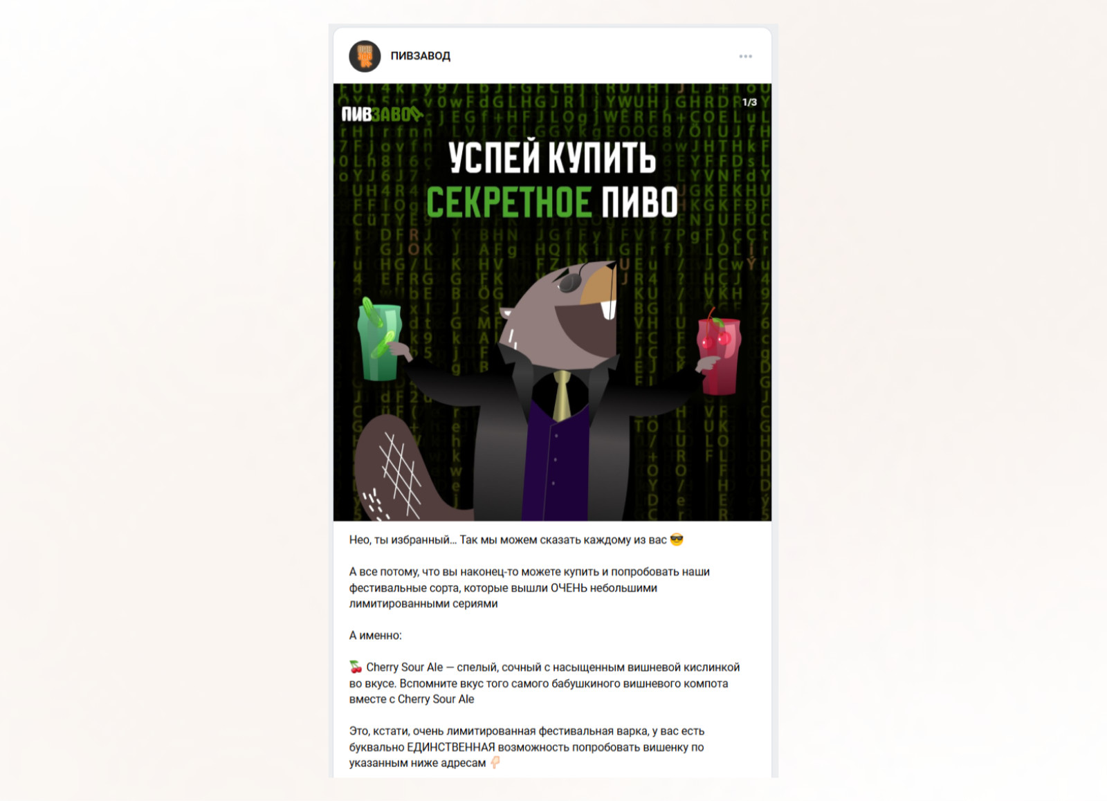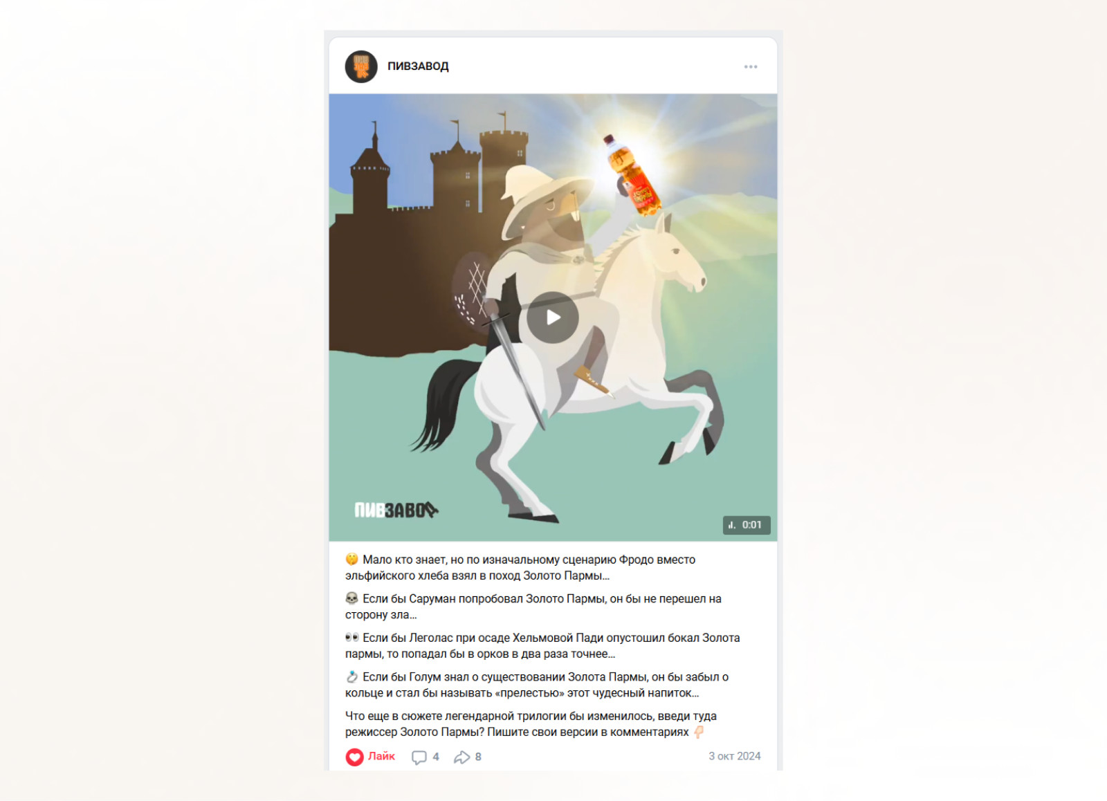 В первом случае мы предлагали провокационные, спорные или триггерные темы, связанные с пивом, и предлагали подписчикам высказываться. В результате дискуссии в комментариях затягивались на месяцы, поднимая нам ER до небес. Во втором — стандартный конкурс с небольшой надстройкой: для участия не нужно было писать комментарий, только лайк, подписка и репост. Но! В каждом розыгрыше мы писали: «Говорят, комментарии под этим постом увеличивают шансы на победу... но это не точно. Попробуйте!» И люди пробовали. Очень активно. Заодно привыкали оставлять комментарии под нашими постами и ещё сильнее раскачивали ER. У нас есть продукт — пиво «Золото Пармы». Это метафора на редкое уральское солнце. Можно было бы просто нарисовать картинку: бутылка пива, кружка, вяленый карп и надпись жёлтым шрифтом: «Проведи пятницу с Золотом Пармы». А можно... Переодеть нашего маскота-бобра в Гэндальфа из «Властелина колец», наложить ту самую музыку с цитатой «Я приду на пятый день... с первым лучом солнца», и сделать анимацию, где в руке героя сияет бутылка «Золота Пармы». Нужно одновременно анонсировать две новинки: вишнёвую и огуречную. Пусть бобр станет Морфеусом из «Матрицы» и держит в руках две кружки соответствующих цветов вместо таблеток. Если нам нужно распродать не самый популярный сидр — как вызвать к нему интерес? Изобразить бобра-мушкетёра, не упоминать название сидра, но пообещать первым трём угадавшим — литр сидра в подарок. Как только название было разгадано, сидр исчез с полок за один вечер. А заказчик только и успевал чесать голову — как бы распродать этот сидр? Креативом! Бобриная версия рукопожатия из аниме «Стальной алхимик»? Маленькие милые пивозавры, марширующие за бобром в Пивзавод? А может, любовный интерес бобра — в кожанке и с ярко-красной помадой? Даже самые обычные вещи — вроде акций на снеки или пожеланий хороших выходных — мы делаем экстраординарными и привлекаем к ним экстраординарное внимание. Мы веселимся, подписчики веселятся, заказчик веселится, ER растёт, продажи растут — все счастливы. Так вышло, что мы случайно, но очень удачно попали в тренд. Благодаря одному крайне эмоциональному поляку-натуралисту в мире появился мем «БОБР КУРВА». Обычно мемы живут недолго, но из-за того, что «БОБР КУРВА» стал почти фразеологизмом, наш персонаж автоматически попал в мета-мем. А затем SLAVA SKRIPKA выпустил шуточную песню «БОБЕР» и ещё больше укрепил популярность нашего персонажа как символа чего-то модного и трендового. Естественно, при создании контента мы не игнорировали этот тренд. Например, сделали свой небольшой клип под вышеупомянутую песню с нашим бобром. Наши подписчики тоже не остаются в стороне. До сих пор под каждым вторым постом всплывают комментарии «БОБР КУРВА» и вопросы: «Когда уже будет пиво с бобром?» — Рост охватов с начала работы — на 300% — Крайне лояльное комьюнити: 90% обратной связи в сообщениях и комментариях — позитивная — Рост просмотров сторис с начала работы — на 213% — Автономный UGC-контент: пользователи сами предлагают темы постов и видео, делятся мемами и участвуют во внутренних обсуждениях — Рост ER с начала работы — с 8% до 24% У клиента была проблема: люди неохотно переходили с физических карт на приложение. Нужно было замотивировать пользователей скачать приложение и активировать в нём свою карту лояльности. Что